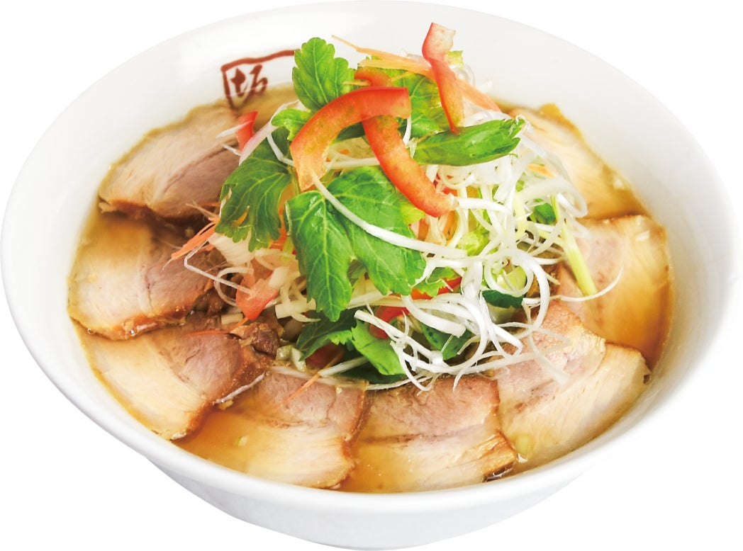 焼豚には、社長自ら原産国スペインへ赴いて厳選した熟成豚肉を使用しています。口の中でトロける脂身とジューシーな柔らかい赤身の美味しさが特徴のトロ旨焼豚です。通常は5枚のトッピングを10枚にしてご提供いたします。パワーチャージに最適の一杯です。