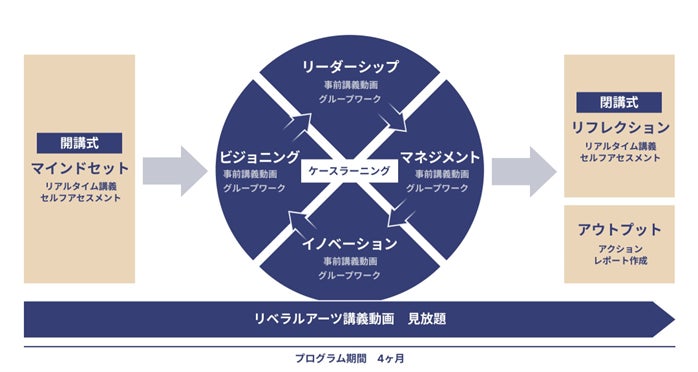 そのため、業務量や心理的負担の増加などで忙しい次世代リーダー向けに、リベラルアーツを効率的に学び、“リベラルアーツ思考”を効率的に強化できるプログラムを開発しました。大学教授等による自然科学や人文科学、社会科学等の質の高い講義動画によるインプット、ビジネスとアカデミックを越境する思考トレーニングにより固定観念にとらわれないビジネス創造力を養成するケースラーニングのアウトプットをパッケージとした、『リベラルアーツ思考ビジネスプログラム』として、企業向けに提供して参ります。