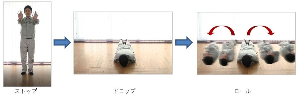 〇ストップ、ドロップ&ロール(止まって、倒れて、転がって)を行う。