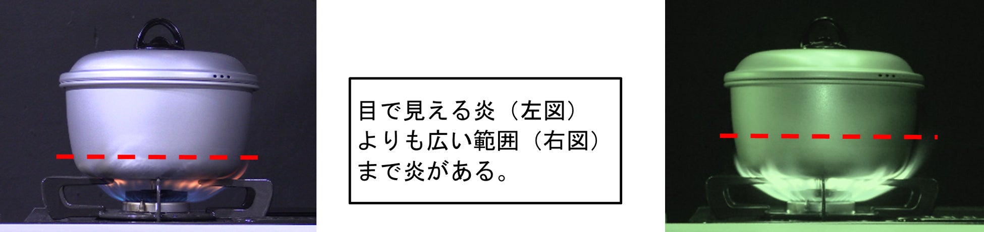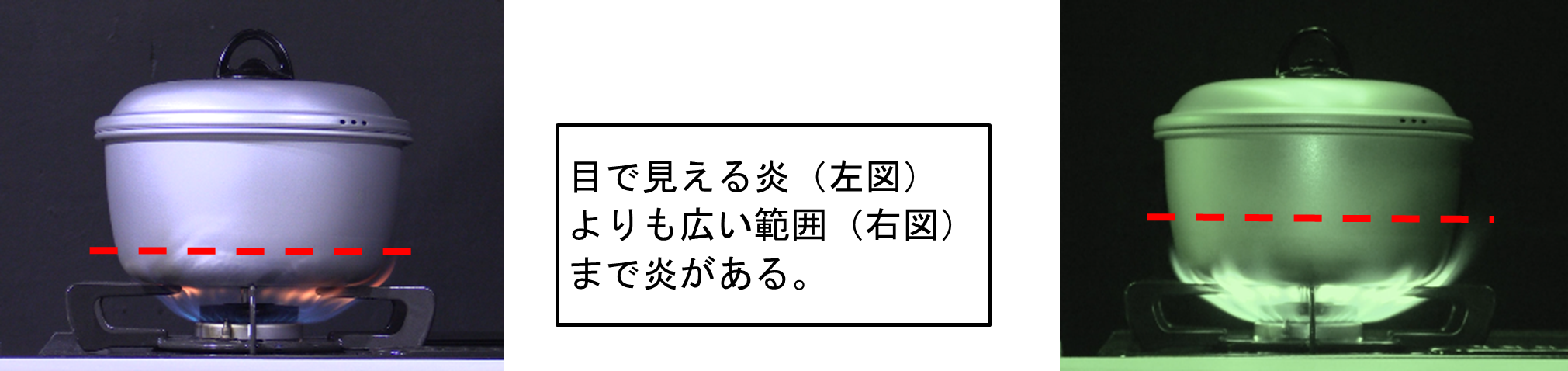 ガスこんろなどの炎は、目には見えていない部分にも存在するため、目に見えている炎から離れていても着火する可能性があります。特に冬の時期は重ね着などで衣服の厚みが出るため、衣服の過熱や着火に気付きにくくなります。衣服と炎や熱源との距離を常に意識して近づき過ぎないよう注意してください。