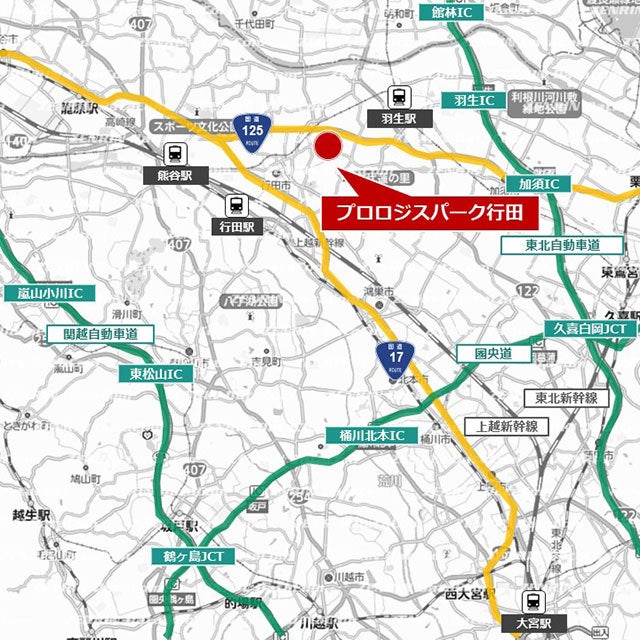 開発予定地は国道125号「行田バイパス」に近接、国道17号線への交通の便も良好です。東北道「羽生IC」から10km、「加須IC」から14kmと好立地な富士見工業団地拡張地区内に開発されます。東北・関越道や首都圏全域へのアクセスに優れ、広域配送拠点として交通利便性が高いエリアです。