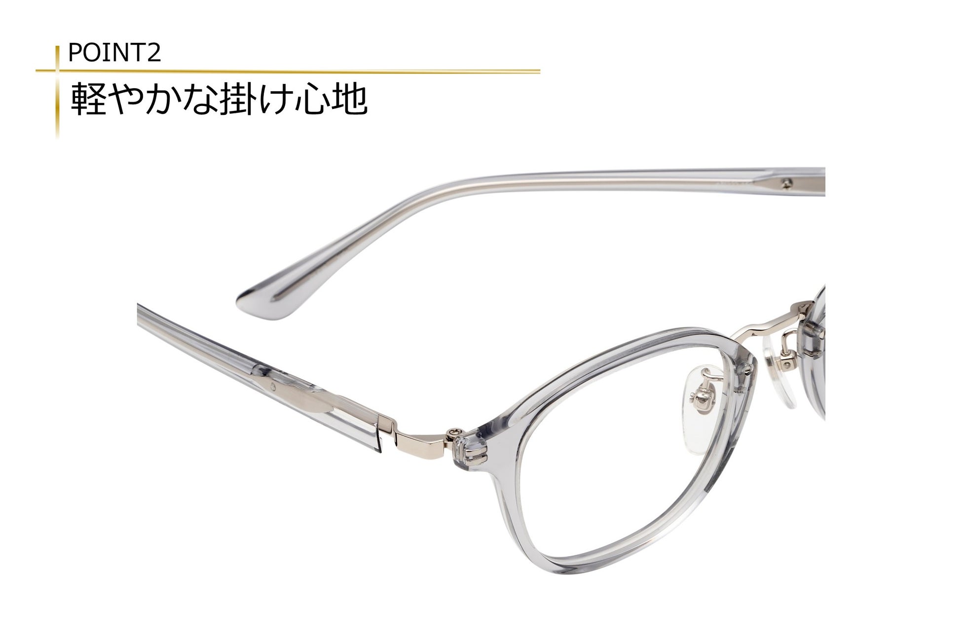 βチタンの板バネ構造を採用することで、可動域が広がり、軽やかな掛け心地を実現しました。顔幅が広い方にも対応でき、サイズが合わずおしゃれなメガネを掛けるのを諦めていた方にも試していただきたいモデルです。