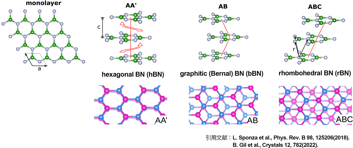 ※図の説明:単一層 BN(mBN)がAA'AA'・・・の順に積層した場合がhBNであり、ABのグラファイト型積層がbBN、ABC 菱面体積層がrBNです。