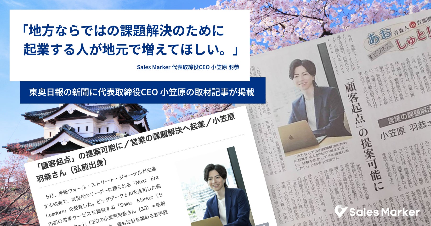 国内初※1「顧客起点」でおこなう新時代の営業手法「インテントセールス」を実現する『Sales Marker(セールスマーカー)』を開発・提供する株式会社Sales Marker(本社:東京都港区、代表取締役 CEO:小笠原 羽恭、以下:当社)は、青森県紙である「東奥日報」に、当社代表取締役CEO 小笠原の取材記事が掲載されたこと、また、当社のYouTubeチャンネル「Sales Update」にて、同者のインタビュー動画を公開したことをお知らせいたします。