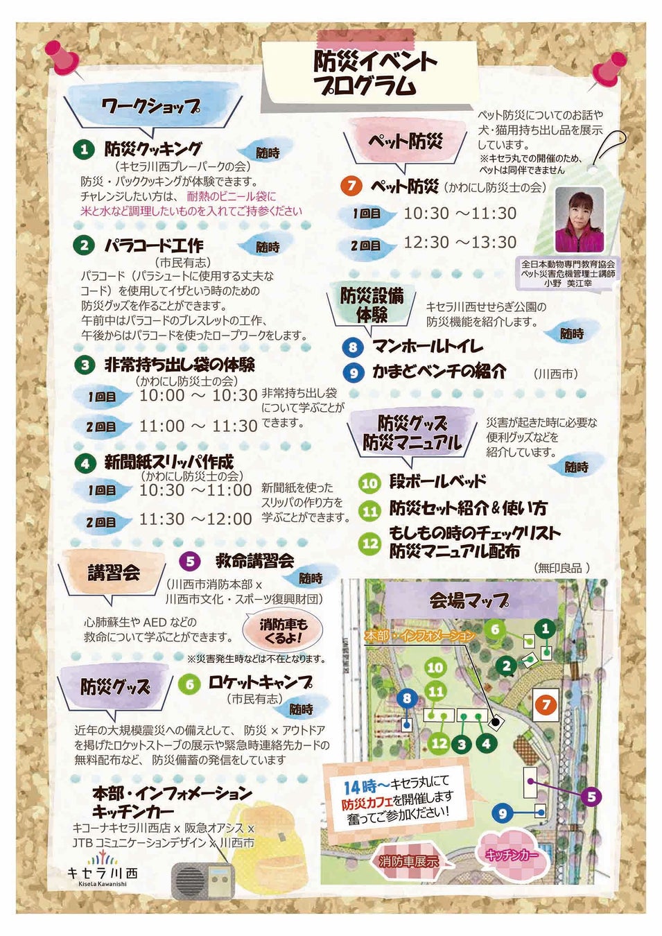 また、救命講習会では心肺蘇生やAEDについて学ぶことができるほか、キセラ丸ではペット防災のお話や犬・猫用持ち品の展示を行う。