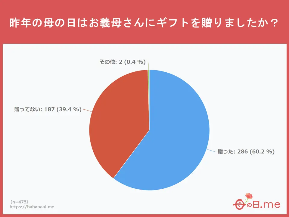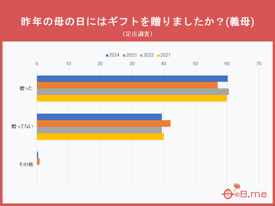昨年(2023年)の母の日に義理のお母さんに贈り物をしたか調査したところ、「贈った」と回答した人が60.2%、「贈ってない」が39.4%となりました。