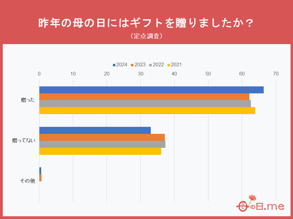 過去3年間の定点調査によると、2023年に母の日ギフトを贈ったと回答した人は66.4%となり、過去(2022年: 62.18%、2021年: 62.66%、2020年: 63.93%)のどの年よりも多い割合となりました。