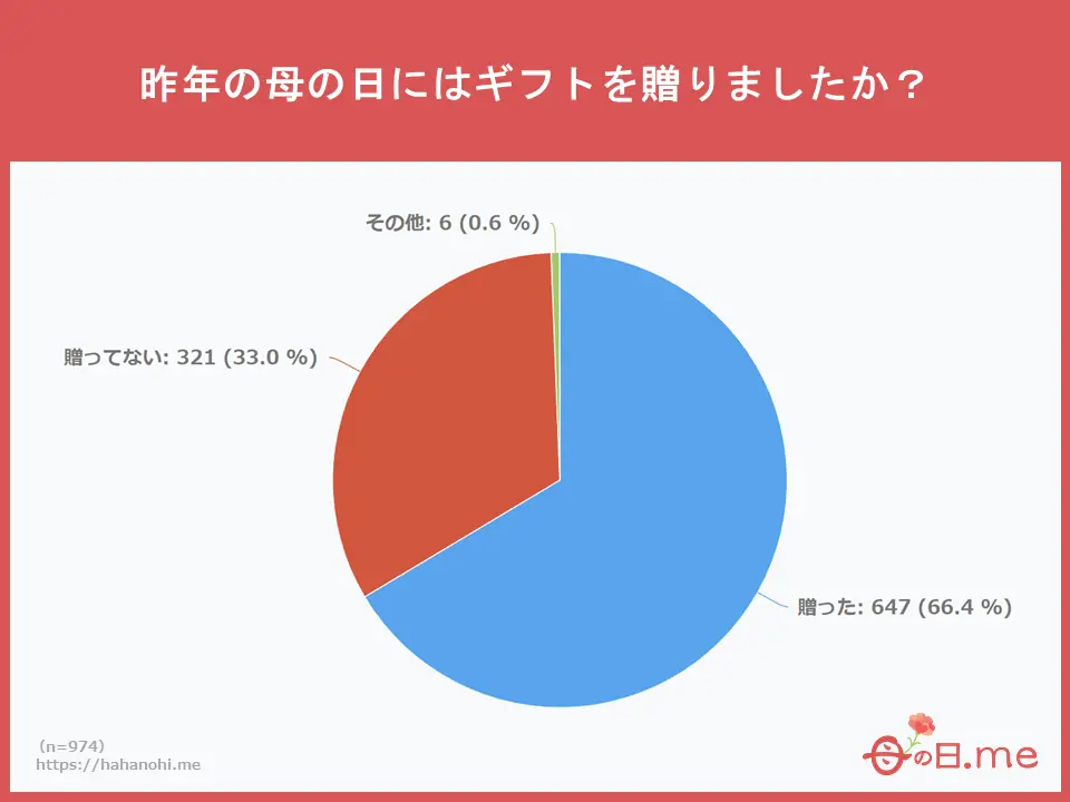 母の日.meが行った昨年の母の日に関するアンケート調査(n=974)によると、66.4%の人が昨年の母の日にギフトを贈っていたことがわかりました。「贈ってない」と答えた33%の方の中には、毎日一緒で身近な存在であるがゆえに特別なギフトは選ばなかったという意見や、金銭的に余裕がなく贈れなかったという意見も多くみられました。