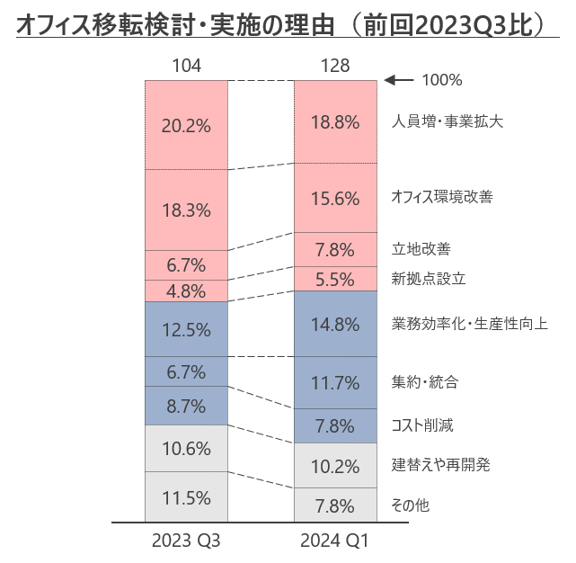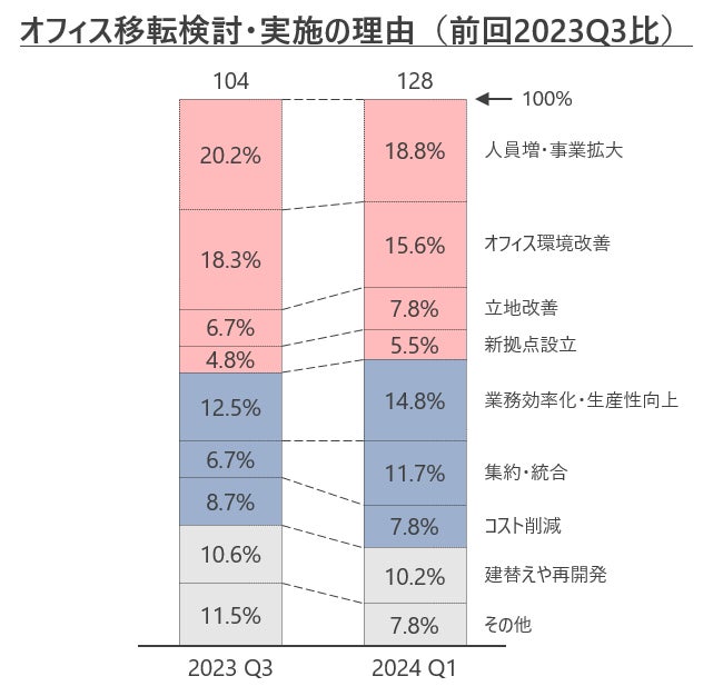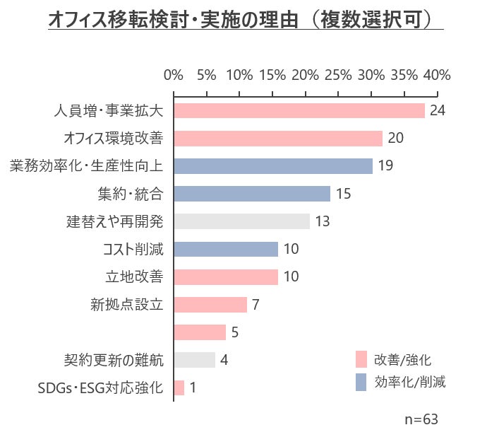 オフィス移転理由については、引き続き「人員増・事業拡大」が最も多く、「オフィス環境改善」が続く結果となったが、前回より割合は低下した。「業務効率化・生産性向上」、「集約・統合」の割合が上昇したことで、「効率化/削減」に関する項目の割合が上昇しているが、引き続き「改善/強化」に関する項目の占める割合が高い。