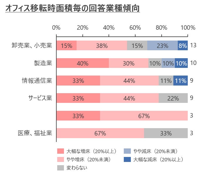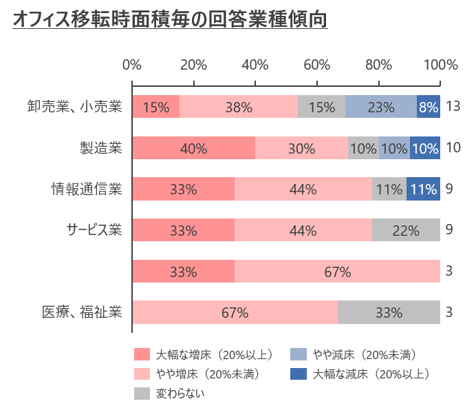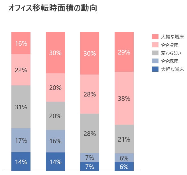 オフィス移転時の面積動向も、2022年3Qから増床傾向となっており、「大幅な増床」、「やや増床」が全体の67%を占め、業種に関わらずオフィス移転時の面積は増床傾向であることが窺える結果となりました。