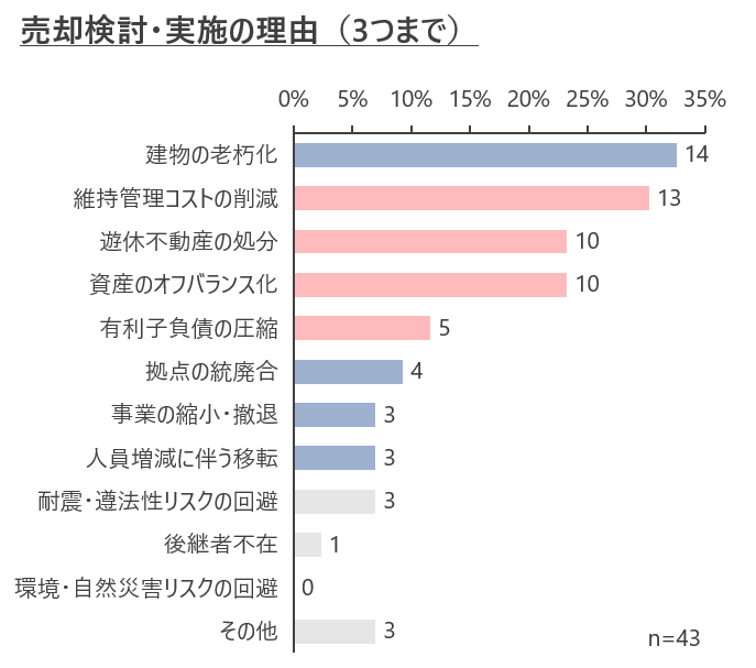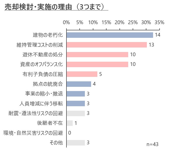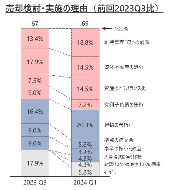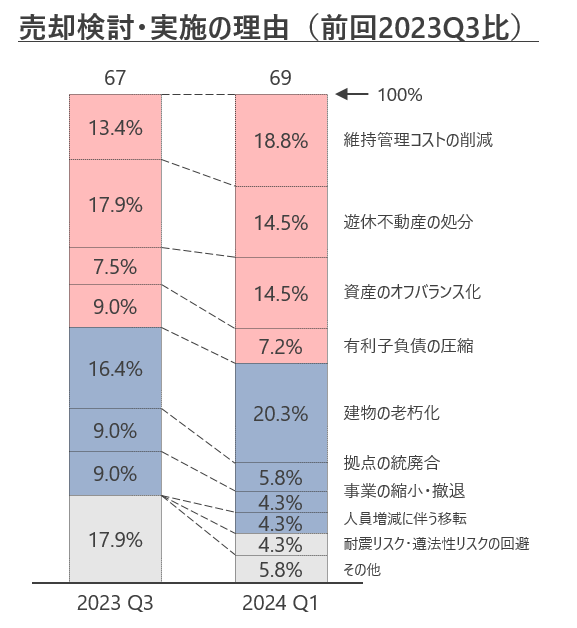老朽化対策が不動産課題の上位となっていることもあり、 不動産売却理由は「建物の老朽化」が最も多く、前回と比較し増加した。また、「維持管理コストの削減」、「資産のオフバランス化」が増加しており、「BS/PL最適化」に関する項目への回答が過半数を占めた。