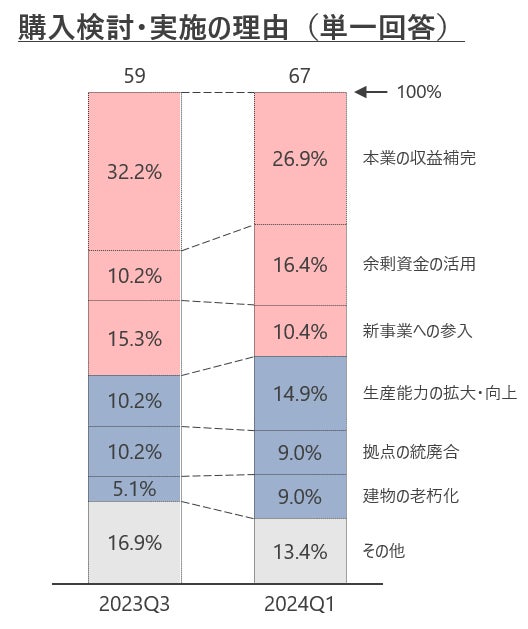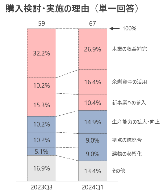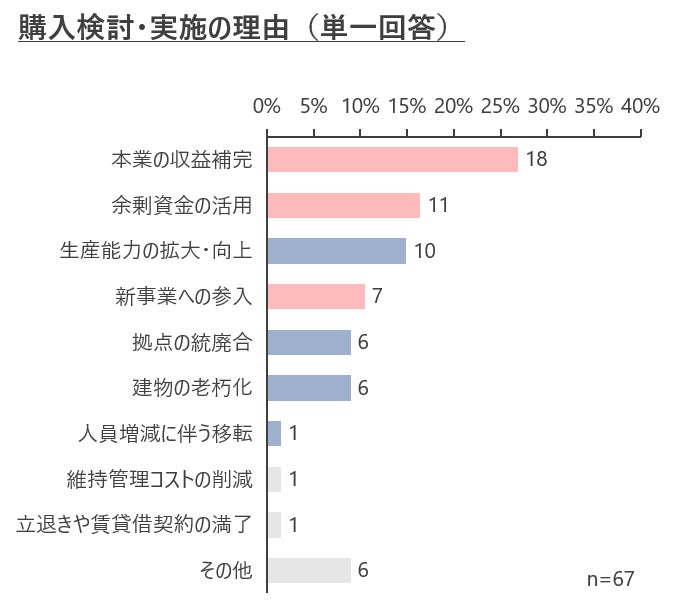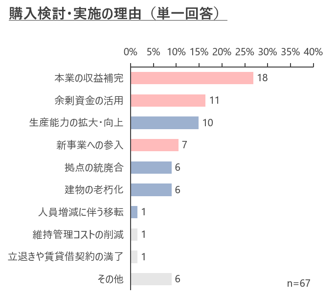不動産購入理由は「本業の収益補完」が最も多く、「余剰資金の活用」が続く結果となった。「本業の収益補完」が減少した一方、「余剰資金の活用」や「生産能力の拡大・向上」が増加しており、本業の業績の好調さが窺える結果となった。