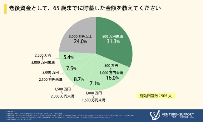 「老後資金として、65歳までに貯蓄した金額を教えてください」と質問したところ、「500万円未満 (31.3%)」と回答した人が最も多く、「500万円~1,000万円未満(16.0%)」「1,000万円~1,500万円未満(7.1%)」「1,500万円~2,000万円未満(8.7%)」「2,000万円~2,500万円未満(7.5%)」「2,500万円~3,000万円未満(5.4%)」「3,000万円以上(24.0%)」という回答結果となった。
