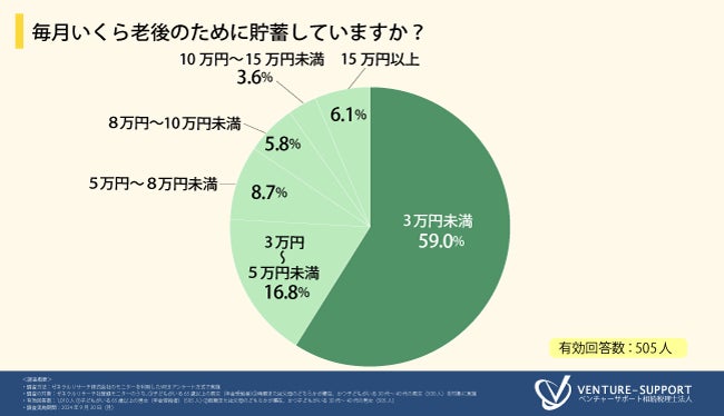 「毎月いくら老後のために貯蓄していますか?」と質問したところ、「3万円未満(59.0%)」と回答した人が最も多く、「3万円~5万円未満(16.8%)」「5万円~8万円未満(8.7%)」「8万円~10万円未満(5.8%)」「10万円~15万円未満(3.6%)」「15万円以上(6.1%)」という回答結果となった。