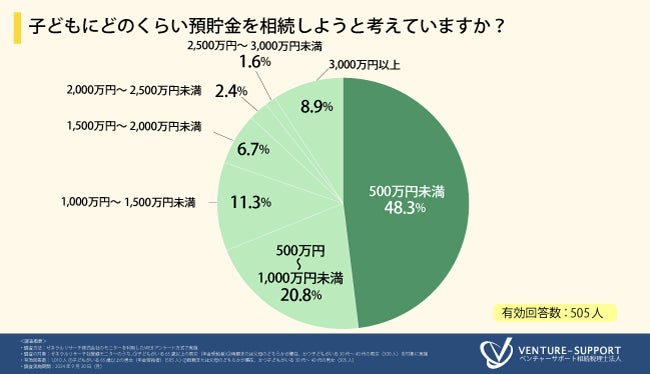 「子どもにどのくらい預貯金を相続しようと考えていますか?」と質問したところ、「500万円未満(48.3%)」と回答した人が最も多く、「500万円~1,000万円未満(20.8%)」「1,000万円~1,500万円未満(11.3%)」「1,500万円~2,000万円未満(6.7%)」「2,000万円~2,500万円未満(2.4%)」「2,500万円~3,000万円未満(1.6%)」「3,000万円以上(8.9%)」という回答結果となった。