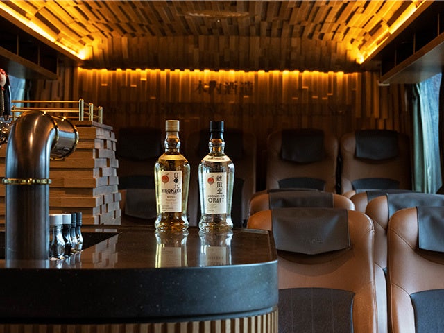 バス車内にはタップ付きのバーカウンターを設置し、出発までの停車時間、道中となるバス車内でも、常陸野ネストビール、日の丸ウイスキーをはじめ、バラエティに富んだ木内酒造のお酒の数々をフリーフローでお愉しみいただけます。