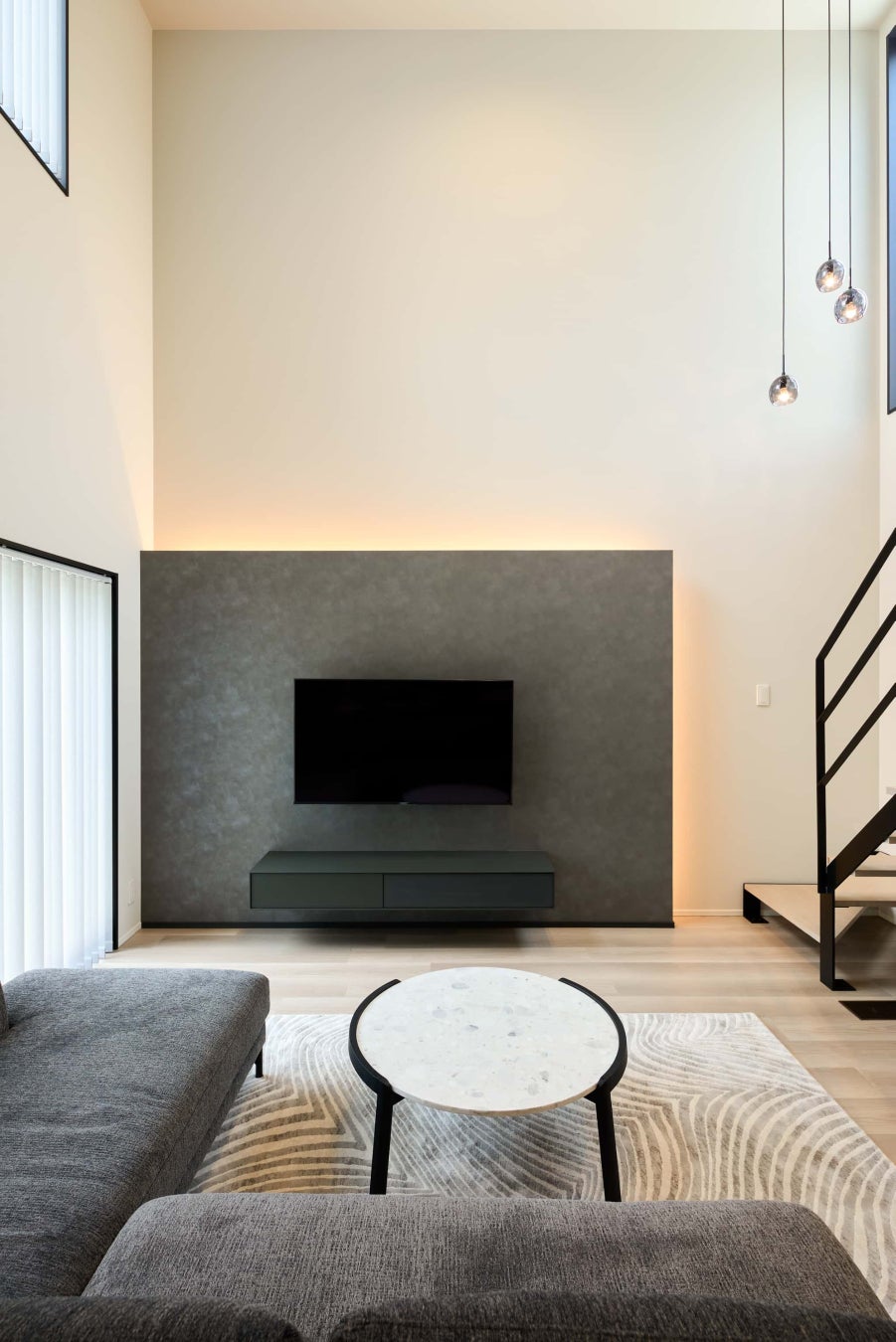 メインの外壁はブラックでまとめつつ、玄関周辺にはアクセントとしてダークグレーのストーンタイルで意匠性を持たせました。家具やキッチン小物はもちろん、照明やサッシなどの細かい部分もブラック×グレーで統一することで一体感のある仕上がりになっています。