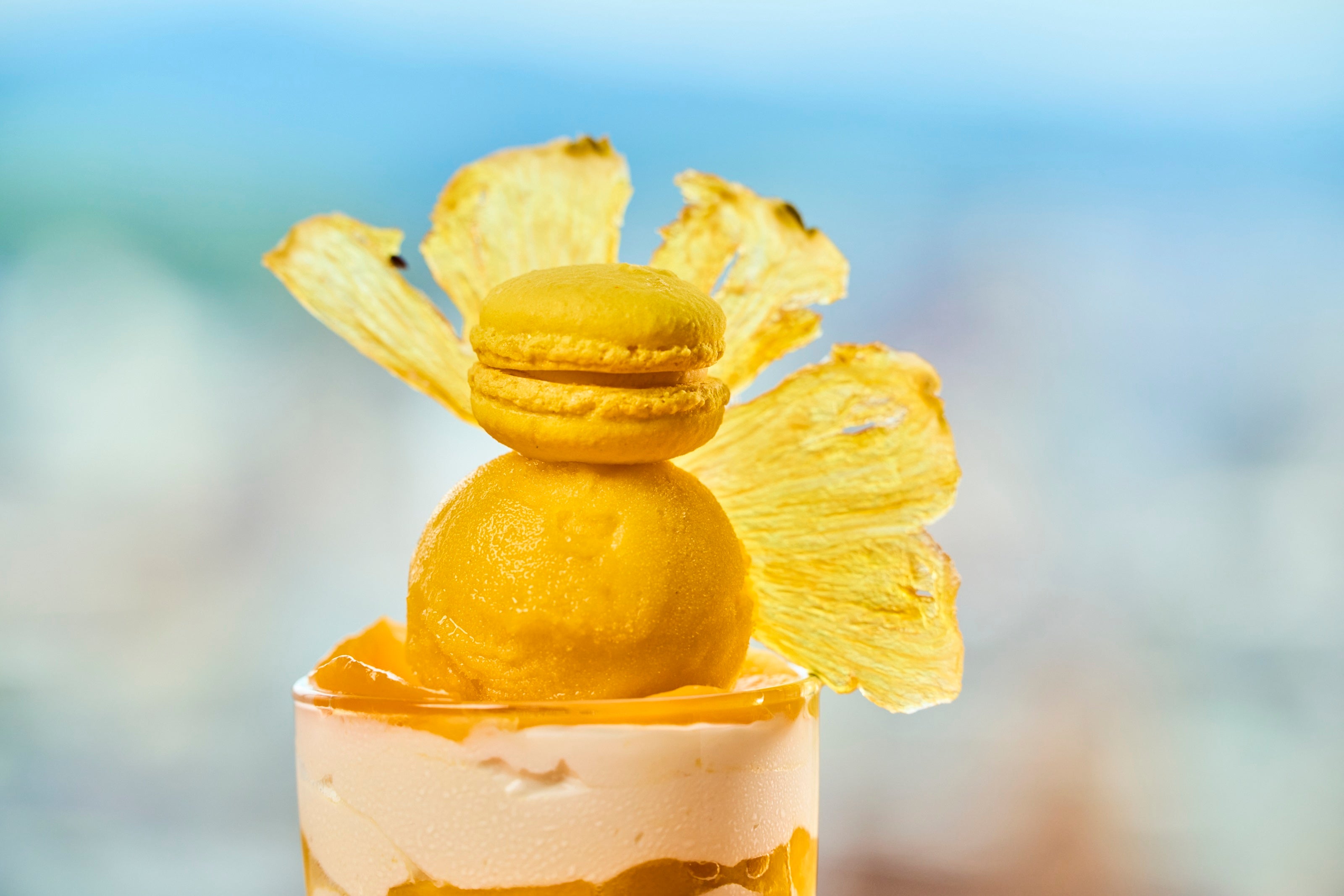 マンゴープリン・カットマンゴー・炭酸ジュレ・ヨーグルトムース・マンゴーシャーベット・マンゴーマカロン・ドライパイナップル