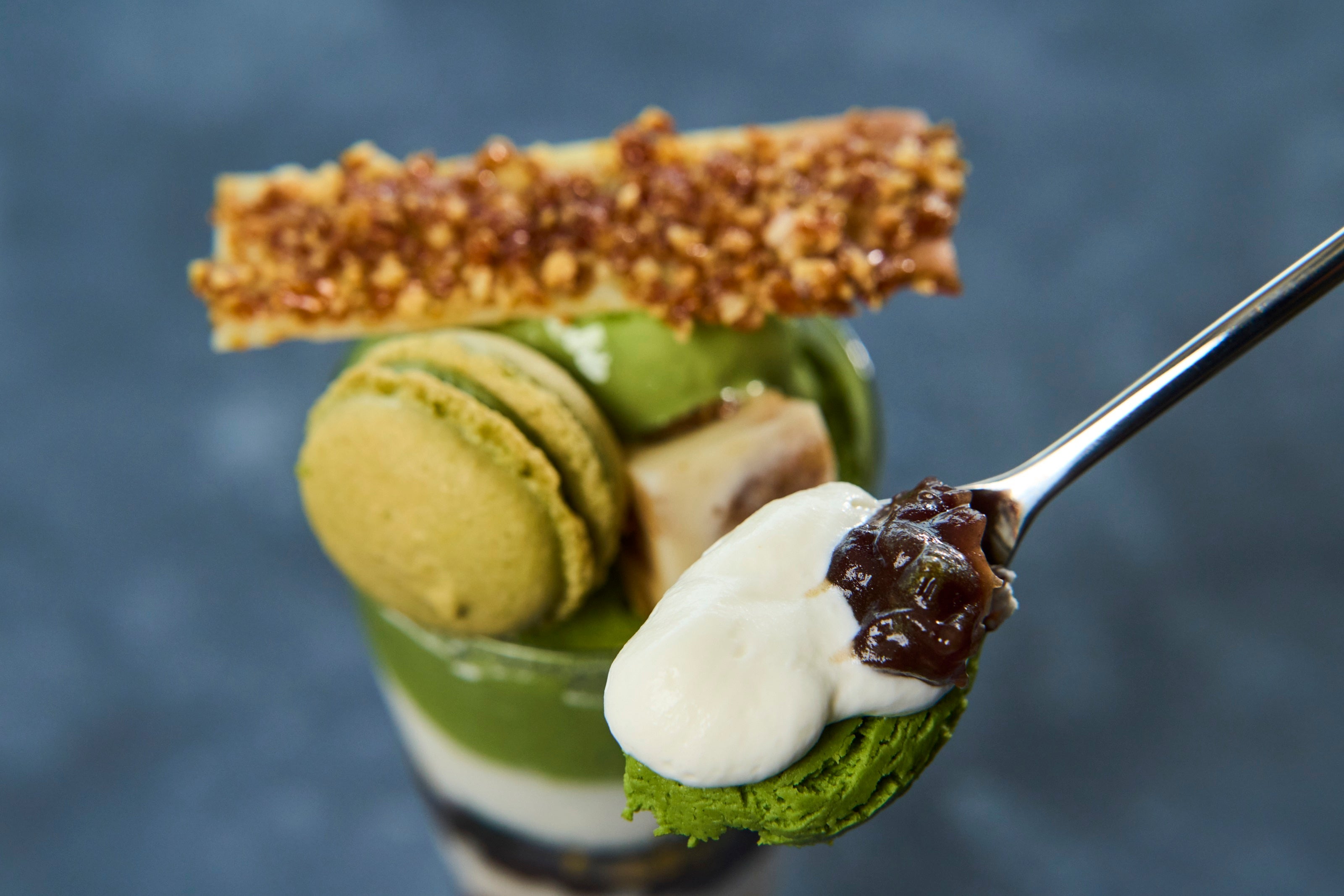 心地よく、そして楽しくお召し上がりいただけるように、もちもちした白玉や抹茶のわらび餅、香ばしいサクサクの生地にしっとりとした抹茶のガナッシュを挟んだマカロンや、ほろ苦さと甘みのコントラストがくせになる春巻きの皮を使った胡桃のキャラメリゼなど、表情豊かな具材を組み合わせ、風味と食感で飽きがこないように計算し尽くしたパフェをご堪能ください。