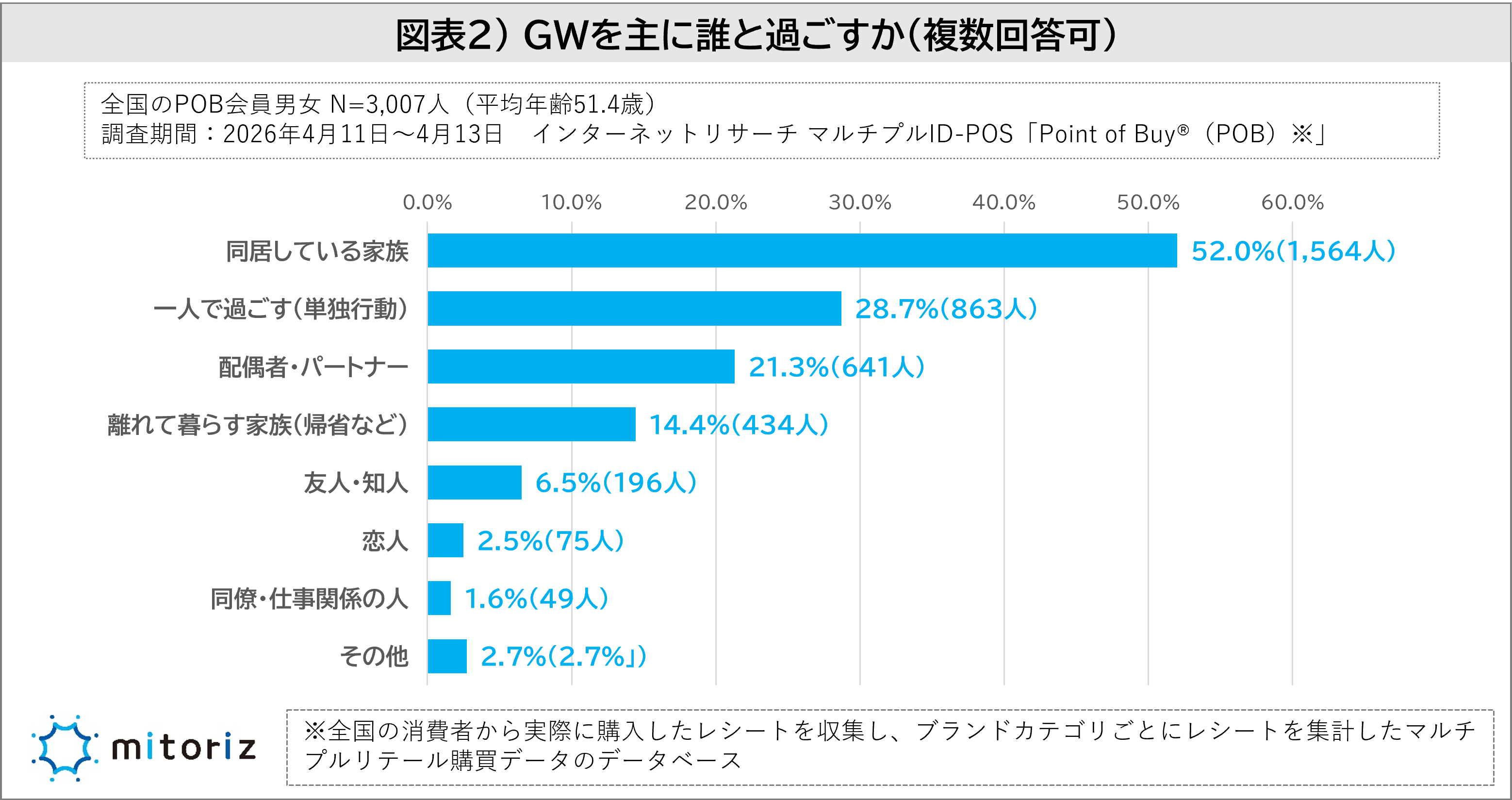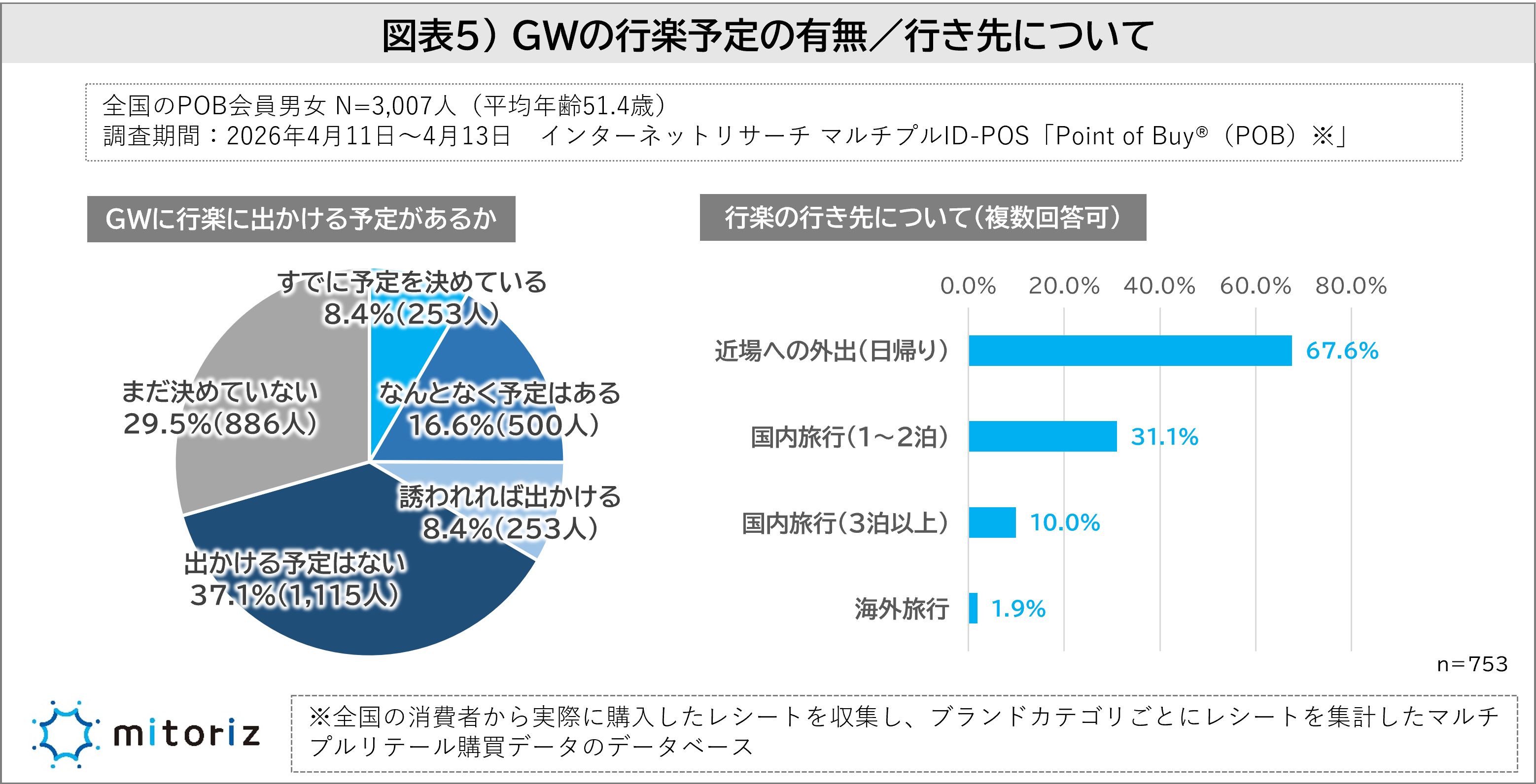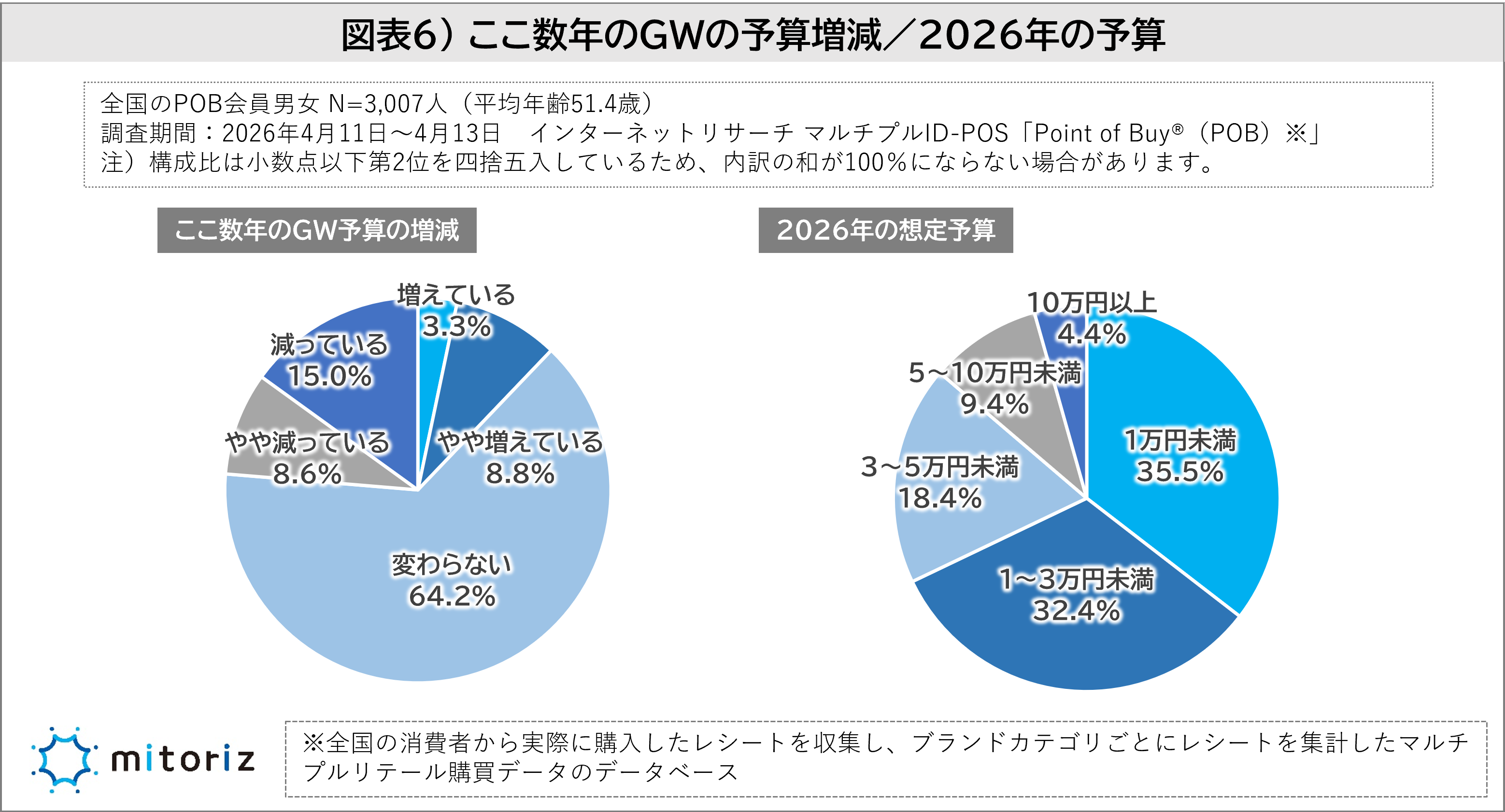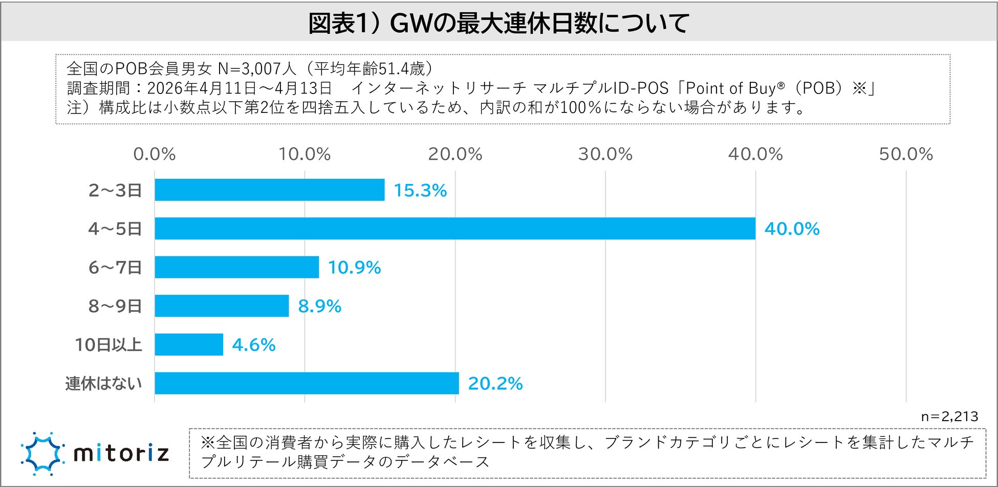 株式会社mitoriz(本社:東京都港区、代表取締役社長:原田光幸)は、消費者購買行動データサービス「Point of Buy®(以下、POB)」の会員3,007人を対象に「大型連休に関する調査2026」を実施しました。