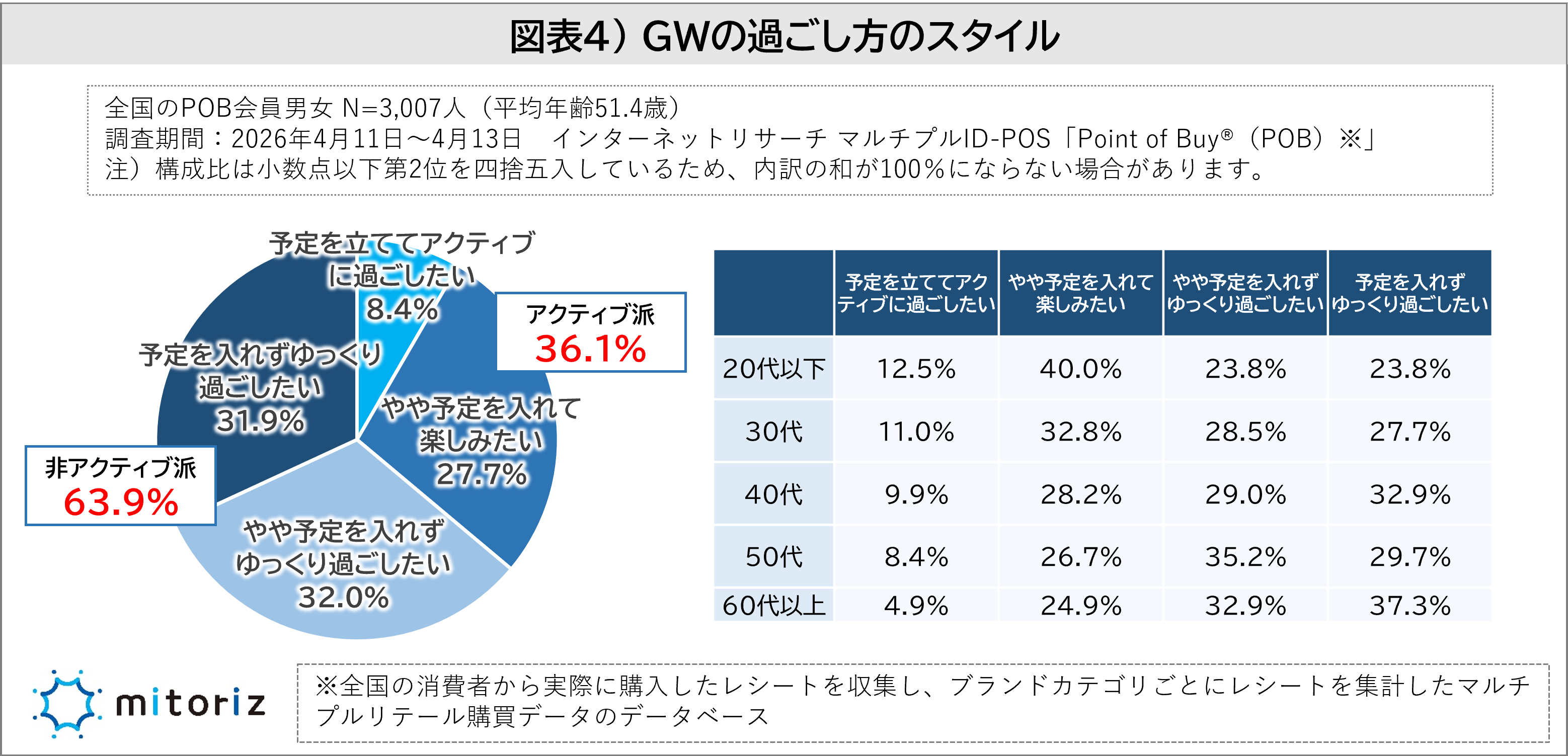 ・GWは「非アクティブ派」が63.9%で多数を占め、「アクティブ派」は36.1%にとどまる