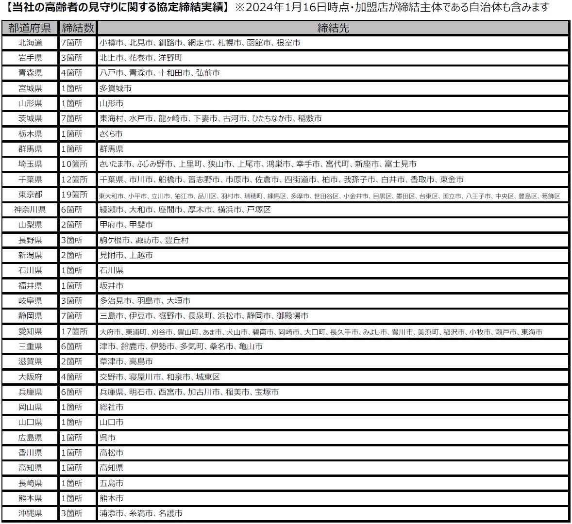 高齢者に密接な事業を展開する当社にとって、「高齢者の見守り」への取り組みは加盟店共々重要と考えています。今回の富士見市との協定締結をはじめ、今後も各自治体等との連携を図りながら「すべてはご高齢者の為に」という想いの具現化に向けて、加盟店と一体となって取り組んでまいります。