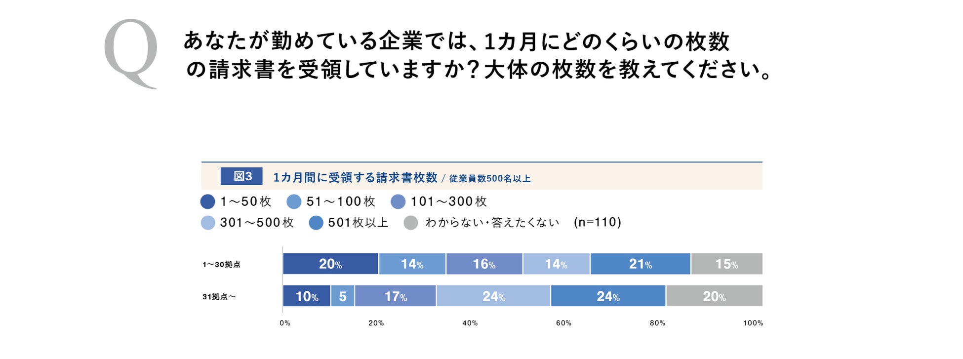 次に、上記図3のように対象を従業員数が500名以上の企業に絞り、拠点数が請求書の受領枚数に与える影響について確認します。従業員数が500名以上かつ1~30拠点の企業においては、各項目の回答に大きな差はみられませんでした。一方、従業員数が500名以上かつ31拠点以上の企業においては、枚数が多い項目ほど割合が高くなる傾向がみられました。このことから、従業員数よりも拠点数の方が、請求書の受領枚数に与える影響が大きいと考えられます。