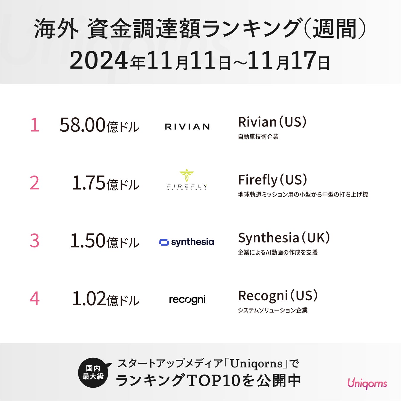 国内最大級のスタートアップメディア「Uniqorns(ユニコーンズ)」が海外2024年11月11日〜11月17日のスタートアップ資金調達状況をランキング形式で発表