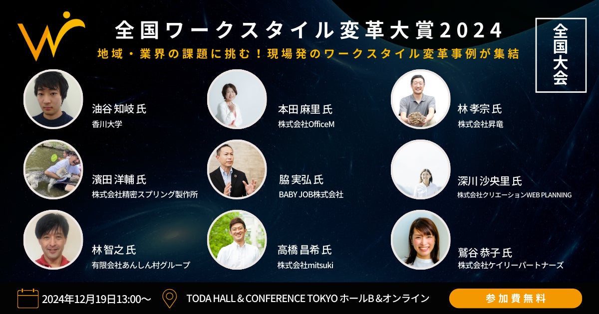 全国ワークスタイル変革大賞実行委員会は、2024年12月19日(木)、TODA HALL & CONFERENCE TOKYOにて「全国ワークスタイル変革大賞2024全国大会」を開催いたします。