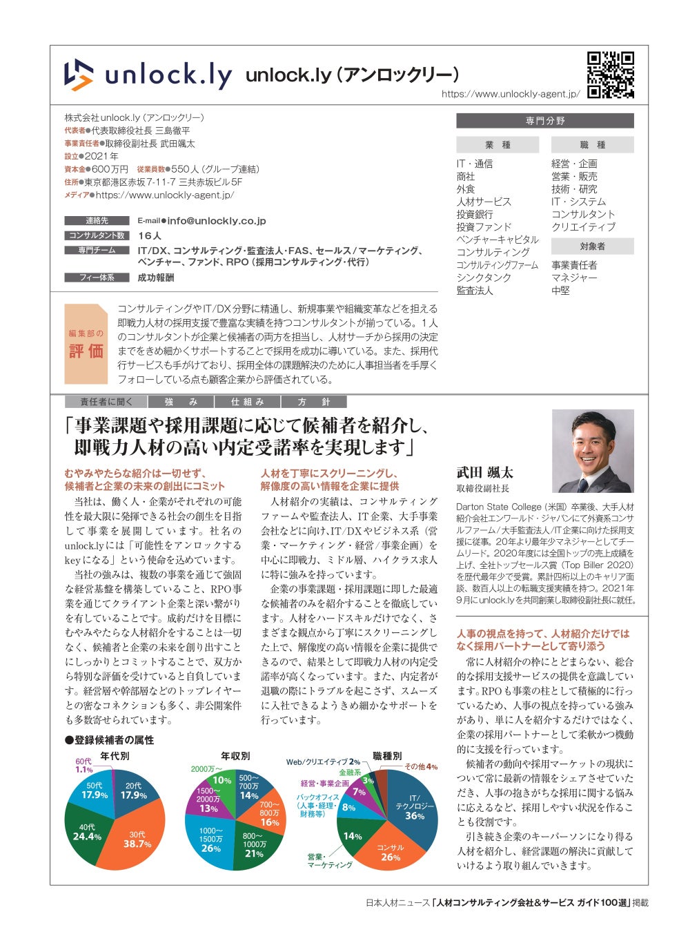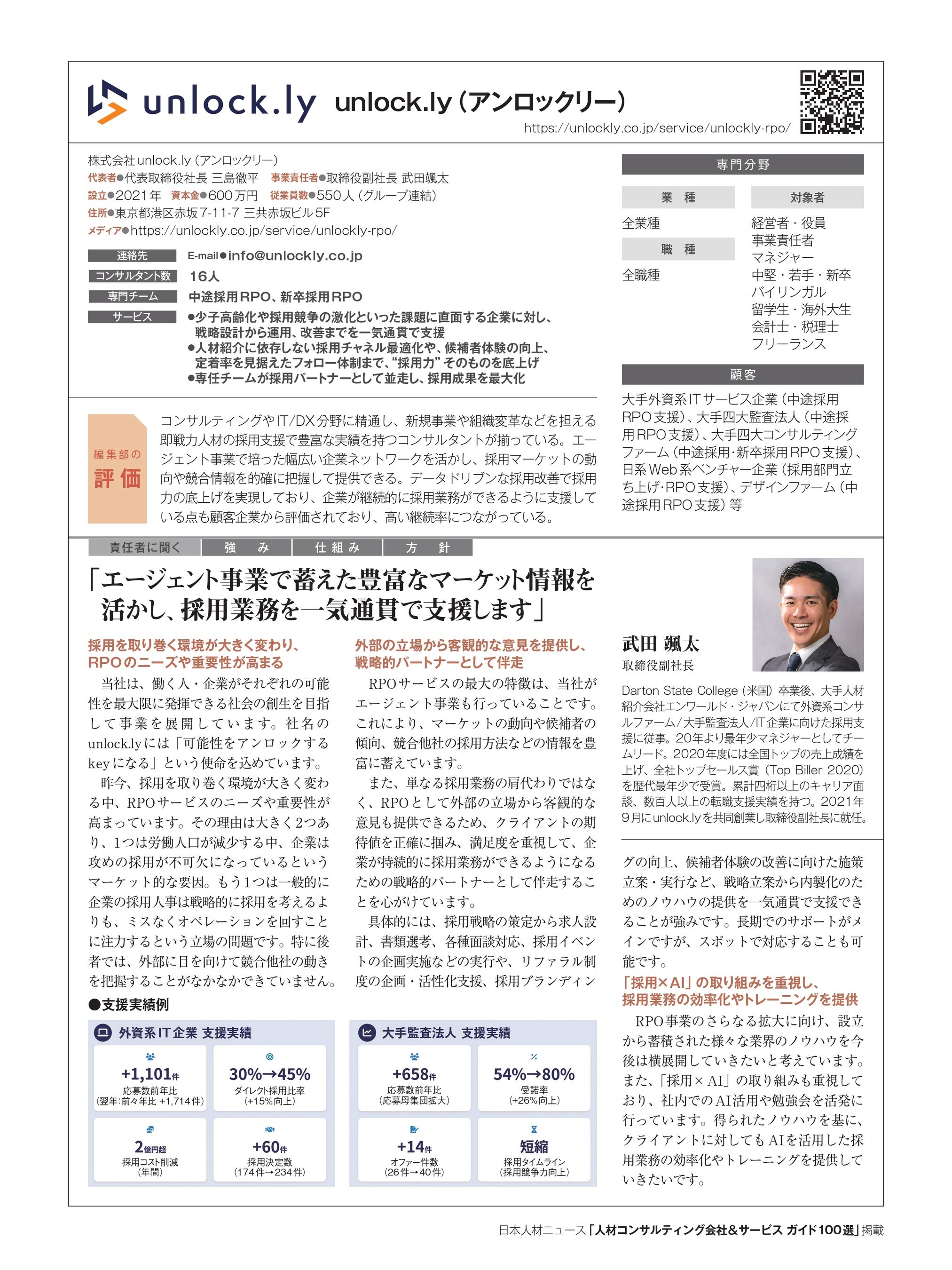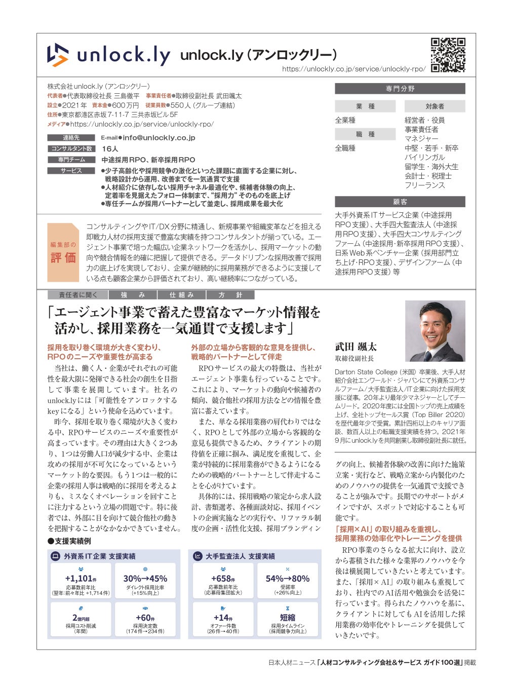 人事専門誌「日本人材ニュース」を発行する株式会社日本人材ニュース社(東京都千代田区、代表取締役:吉越利成)は、企業の人材採用を支援できる優れたコンサルティング会社とサービスを紹介する「人材コンサルティング会社&サービスガイド100選」に、unlock.ly(東京都港区、三島徹平代表取締役社長)が参画したことをお知らせいたします。
