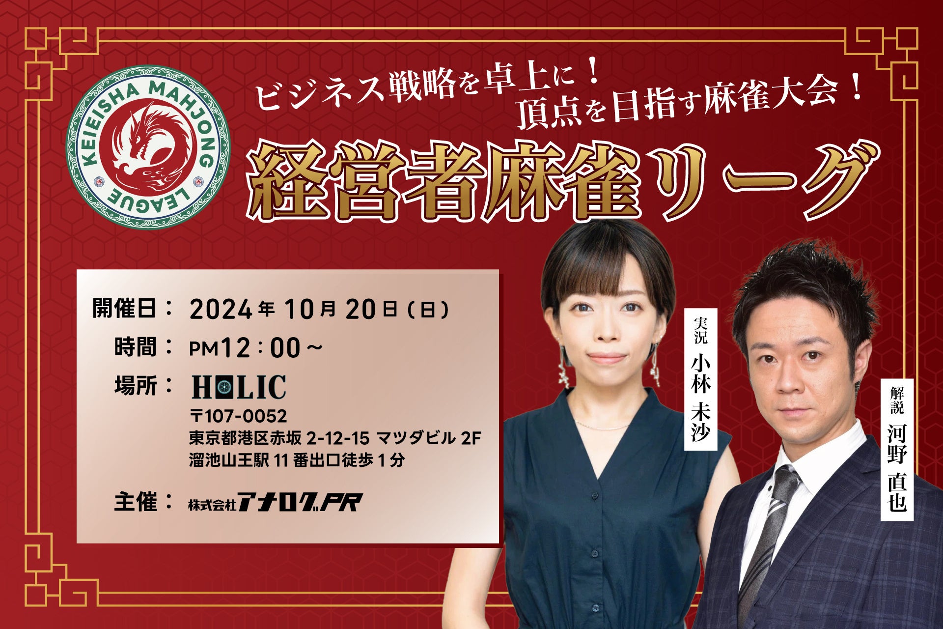 「企業の情報と印象をデザインする」をコンセプトに掲げ、メディアとWEBとオフラインを融合させたマーケティング戦略を提供する、株式会社アナログPR(本社:東京都港区、代表取締役:松浦啓介)は2024年10月20日(日)に第2回経営者麻雀リーグを開催することをお知らせいたします。
