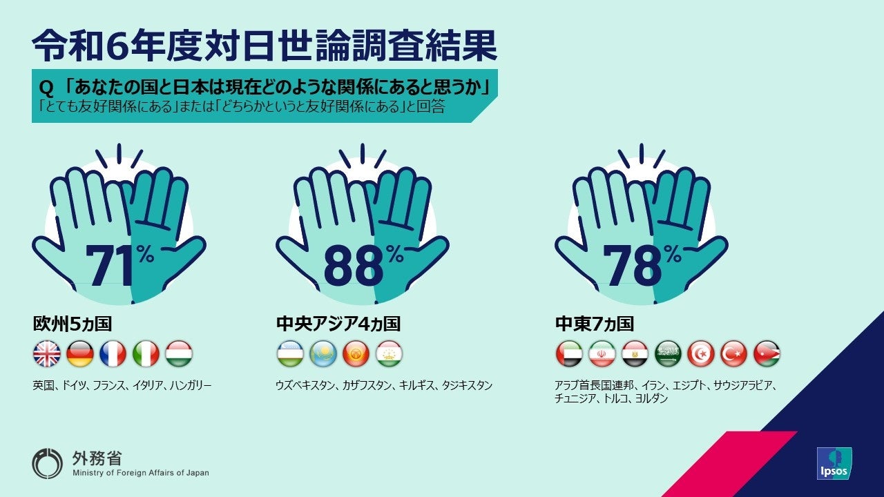 世界最大規模の世論調査会社イプソス株式会社(日本オフィス所在地:東京都港区、代表取締役:内田俊一)は、欧州5か国、中央アジア4か国、中東7か国において対日世論調査を行いました(一般競争入札により外務省から受託)。調査結果は、外務省が発表した「令和6年度海外対日世論調査」をご確認ください。