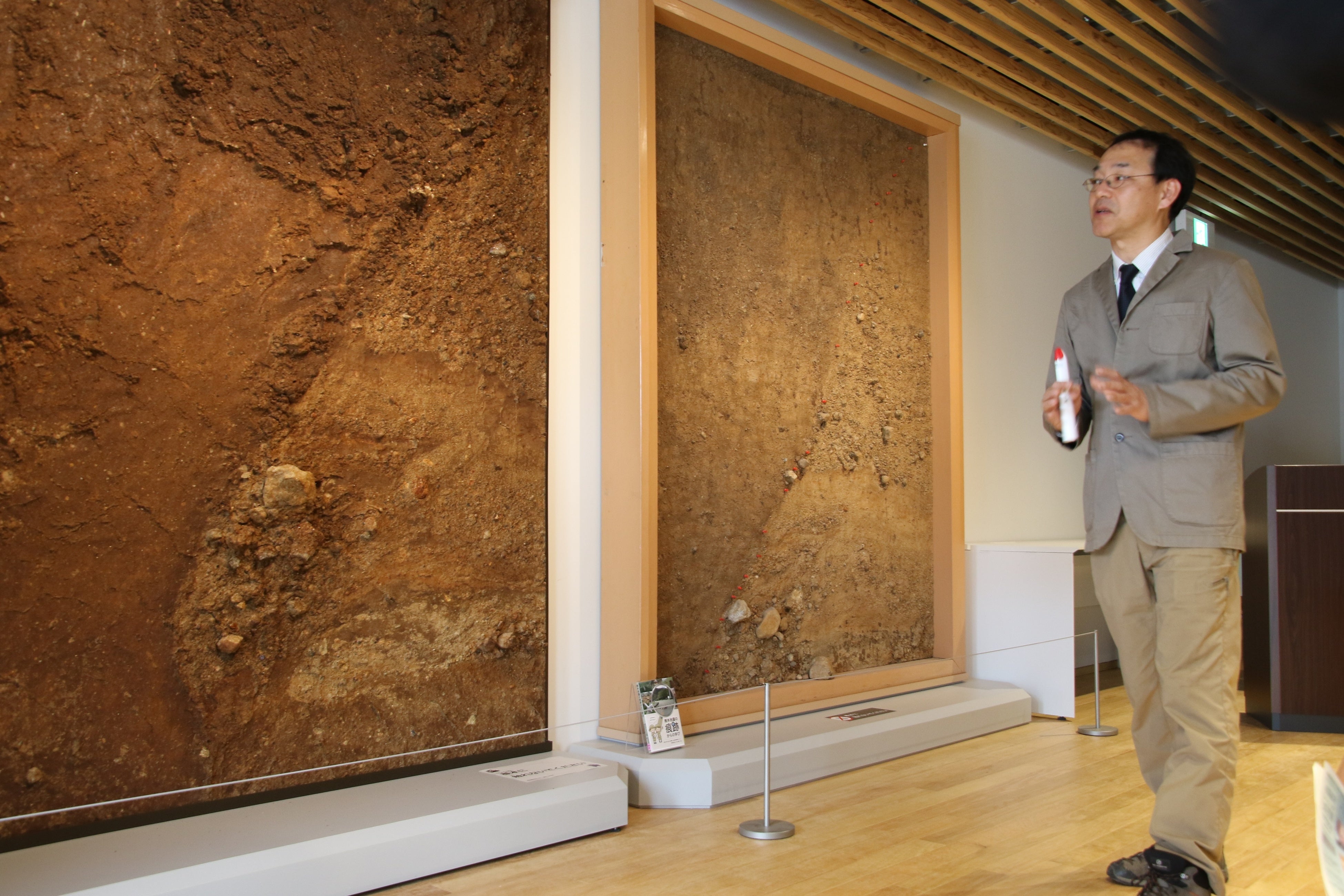 お披露目式では、本学くまもと水循環・減災研究教育センターの鳥井 真之特任准教授が標本について説明を行い、熊本地震前後の活断層がどのように変化したのか比較研究が可能な大変貴重な資料である旨報告がありました。