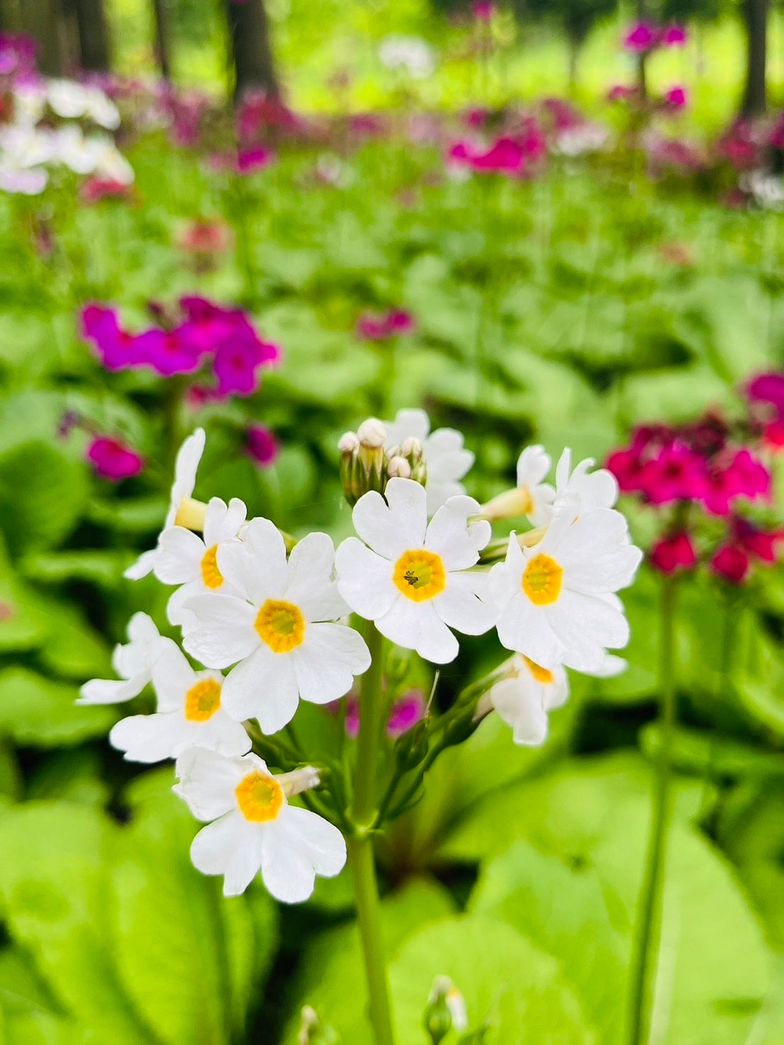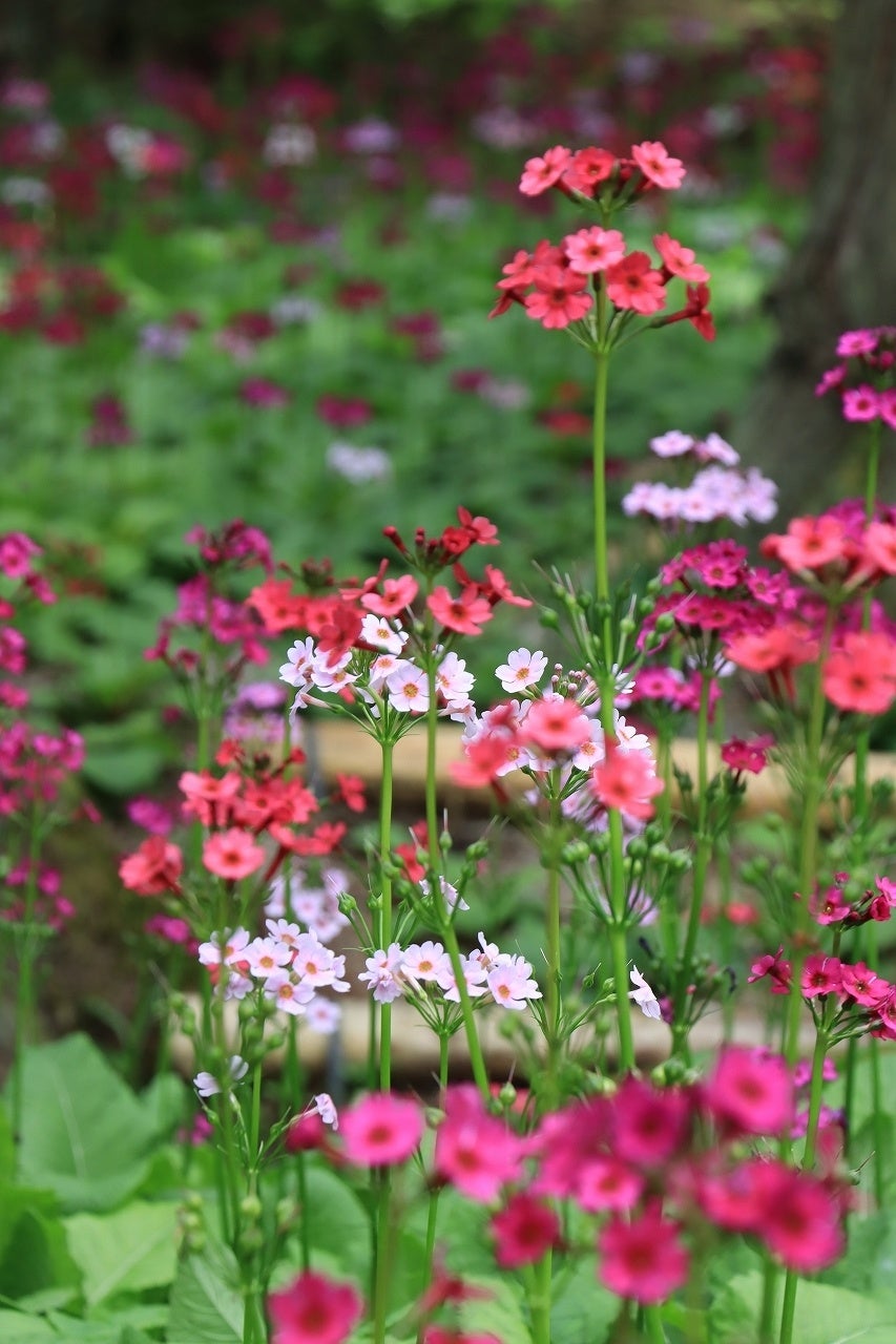 紅紫色や薄ピンク色、白色など色とりどりのクリンソウ