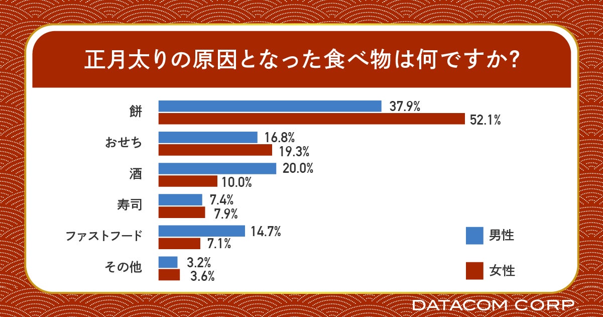 この結果から、男性は「飲酒機会の増加」や「手軽な食事の選択」が正月太りの主な要因となる一方、女性は「餅」や「おせち」など正月特有の伝統的な食文化が大きく影響していることが分かります。