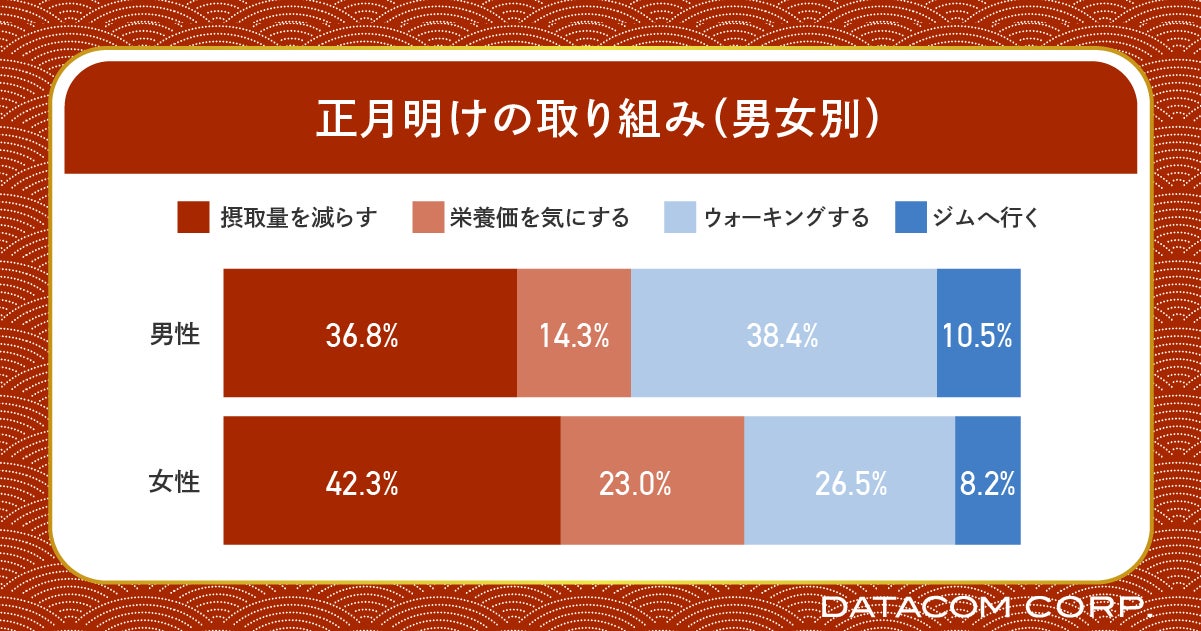 正月太りへの取り組み、"燃やす"男性と"控える"女性で男女差あり?男性は「ウォーキング」、女性は「食事制限」がそれぞれ4割という結果に。正月太り経験者の6割が望む"ヘルシーおせち"が食事制限の救世主!