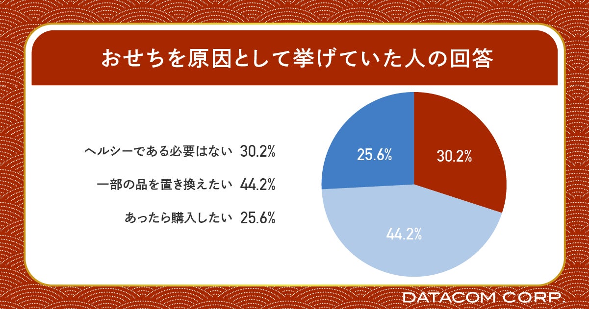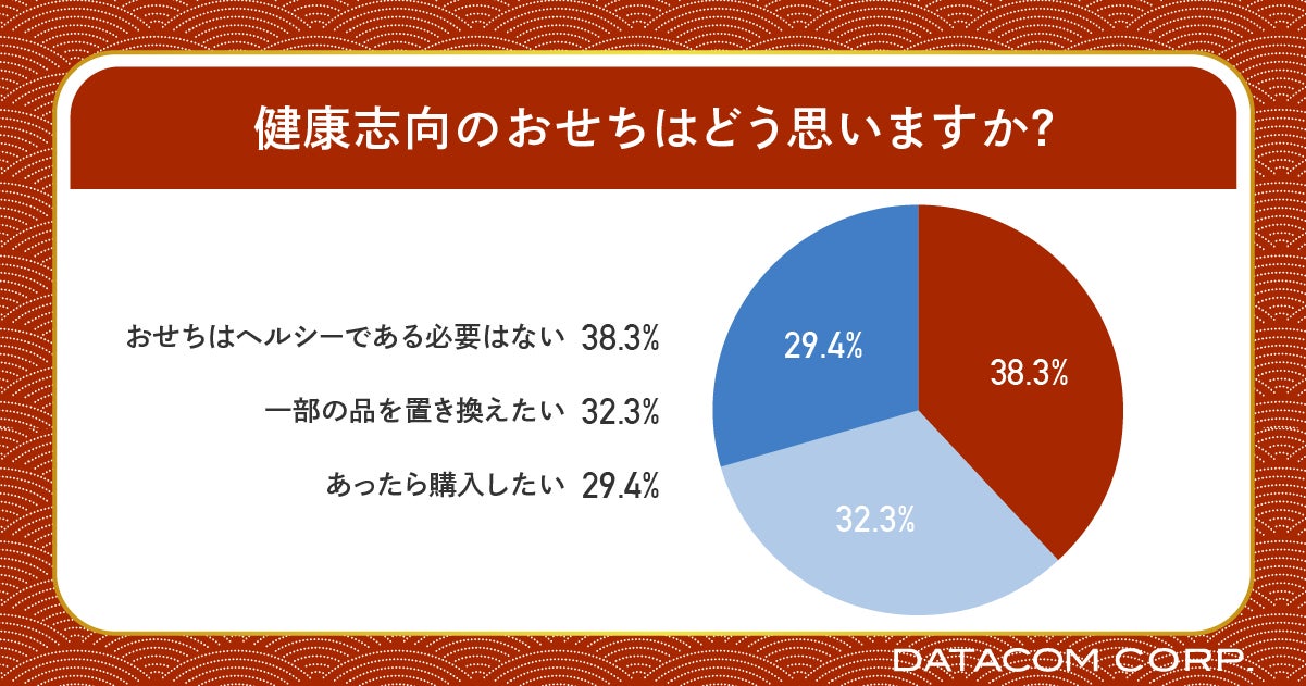 「健康志向のおせち」に対する意見を調査したところ、「ヘルシーである必要はない」と答えた人が38.3%と最も多かった一方、「一部の品を置き換えたい」が32.3%、「あったら購入したい」が29.4%と、約6割が健康志向のおせちに前向きな姿勢を示しました。