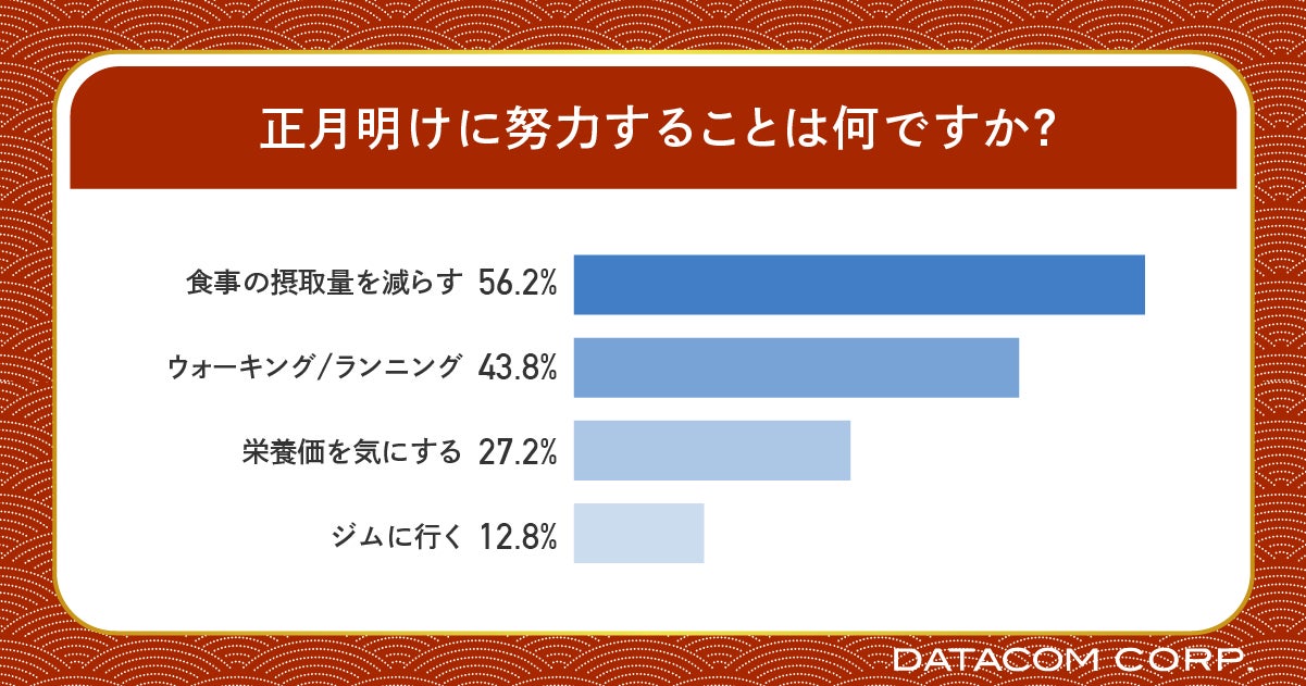 「正月明けに努力すること」を聞いたところ、最も多かったのは「食事の摂取量を減らす」で56.2%。過半数の人が「食事管理」を正月太り解消の主な手段と考えていることが分かりました。次いで、「ウォーキング」が43.8%、「栄養価を気にする」が27.2%、「ジムに行く」が12.8%と続き、手軽に始められる方法が上位を占めました。