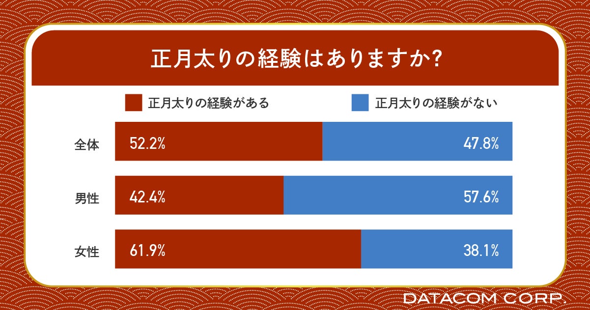 正月太りの経験については、全体の52.2%が「正月太りの経験がある」と回答しました。男女別に見ると、経験ありは男性が42.4%、女性は61.9%と男女間の差が見て取れました。