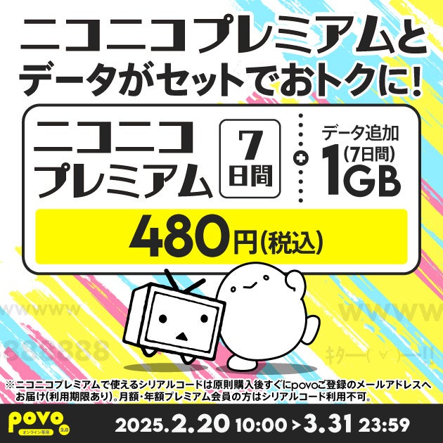 KDDI、沖縄セルラーは2025年2月20日から3月31日まで、povo2.0において、「ニコニコプレミアム(7日間)」と「データ追加1GB(7日間)」(390円相当)がセットになったトッピングを480円で提供します。