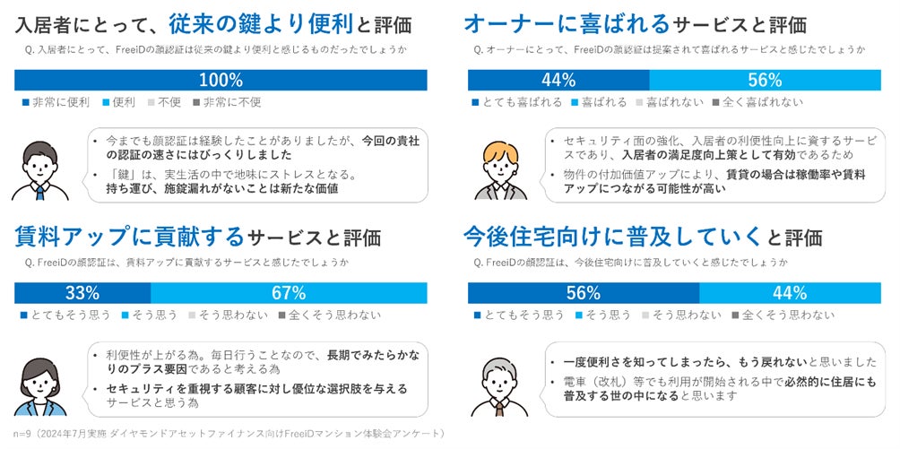 また、自由回答では、「一度便利さを知ってしまったら、もう戻れないと思う」といった入居者目線での評価の他に、「スペックの高いマンションの必要条件と思われ、賃料アップに貢献する」「セキュリティ面の強化、入居者の利便性向上に資するサービスであり、入居者の満足度向上策として有効である」といったオーナー目線での評価、また、「利便性が高いサービス且つ様々な分野への横展開が考えられ汎用性の高いサービスだと感じた」「今後あらゆるところで普及して、当たり前の機能になるのもそれほど遠くないと思った」といった、将来性に対する期待の声をいただくことができました。