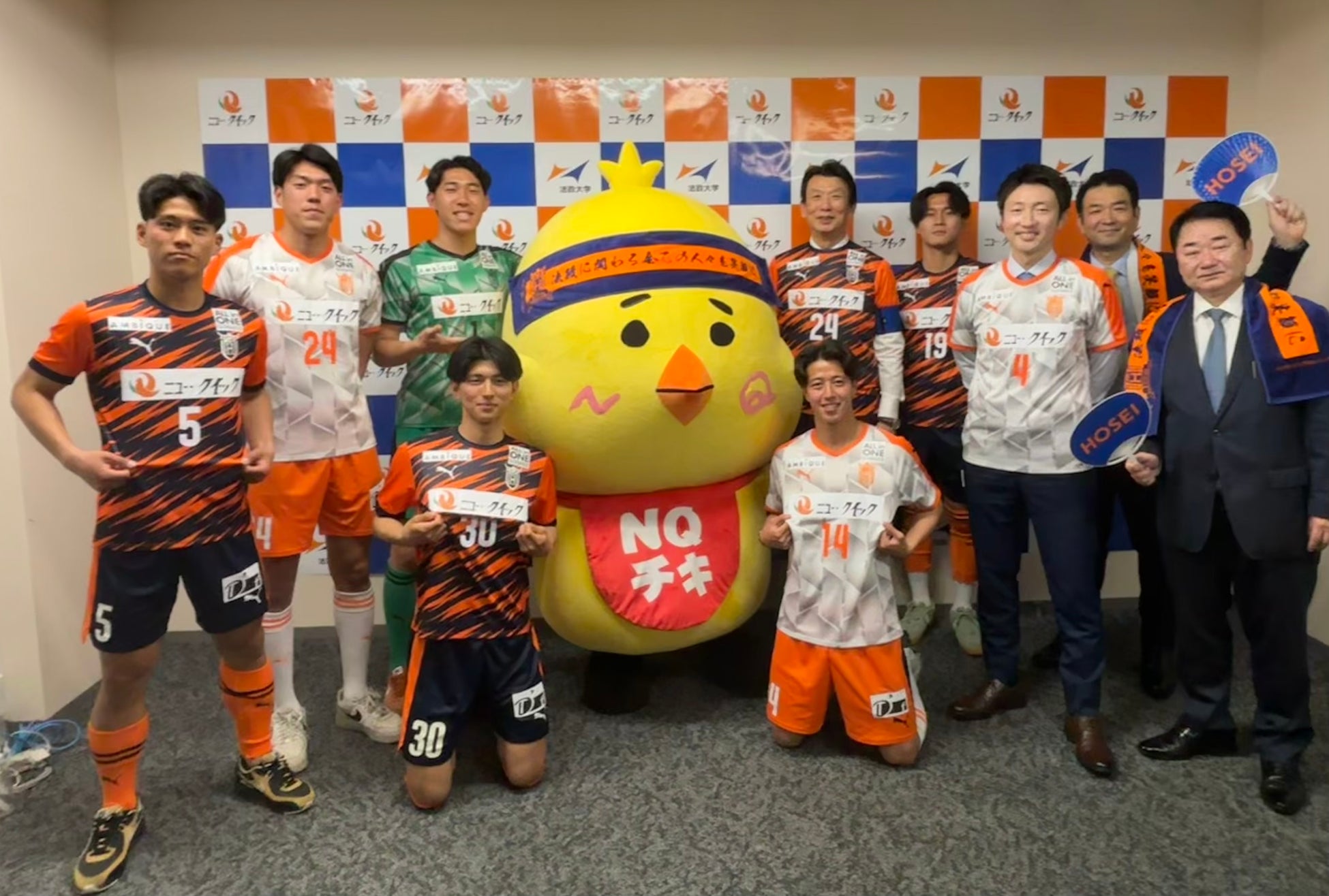 2026年4月1日(水)、法政大学体育会サッカー部の選手・スタッフの皆様がニュー・クイック本社に来社し、代表取締役・林 浩二をはじめ、ニュー・クイック社員との交流および記念撮影を実施しました。スポンサー契約開始後初の交流の場として、今後のシーズンに向けた抱負が語られたほか、ニュー・クイックからは、1部リーグでのさらなる活躍に向けたエールが送られました。