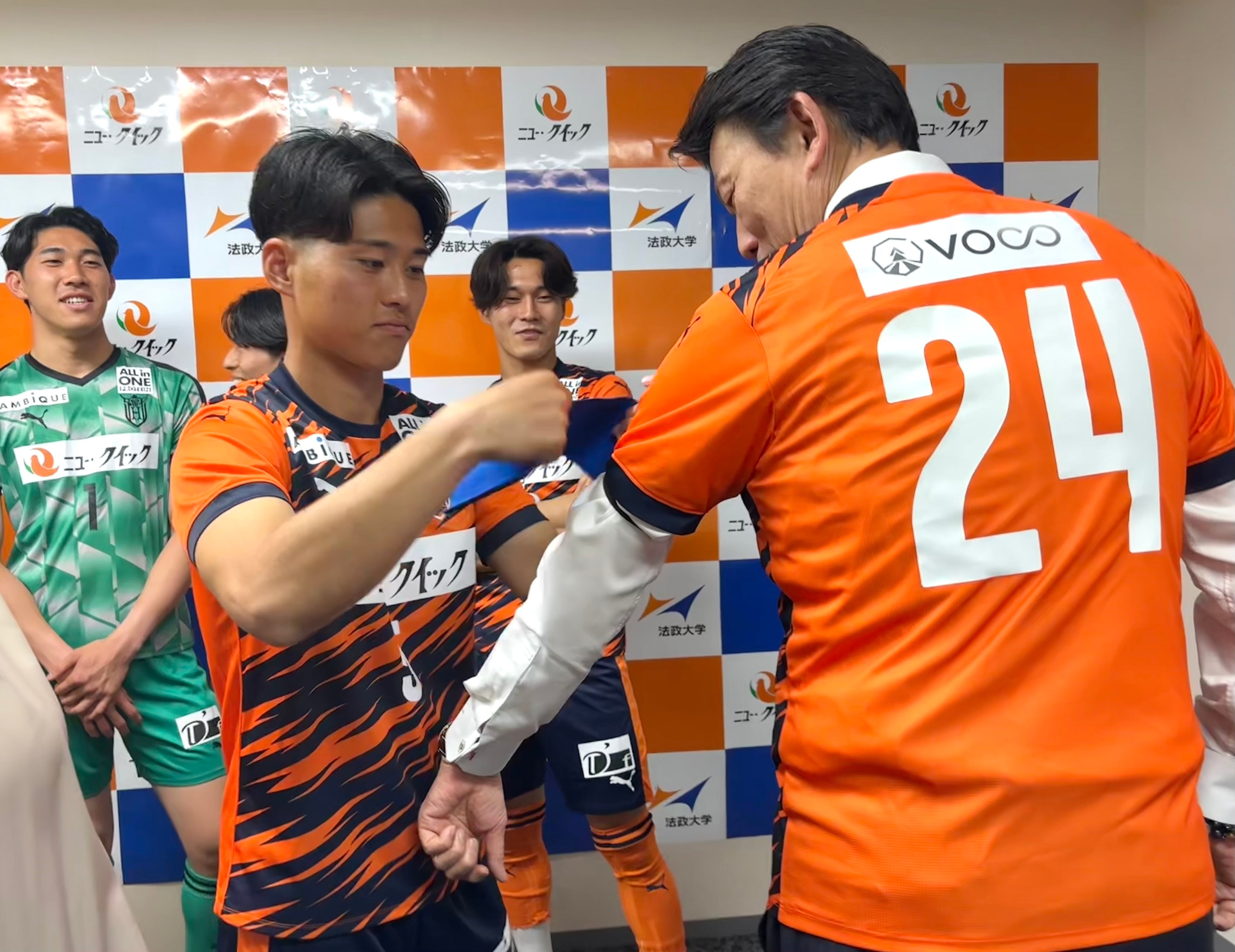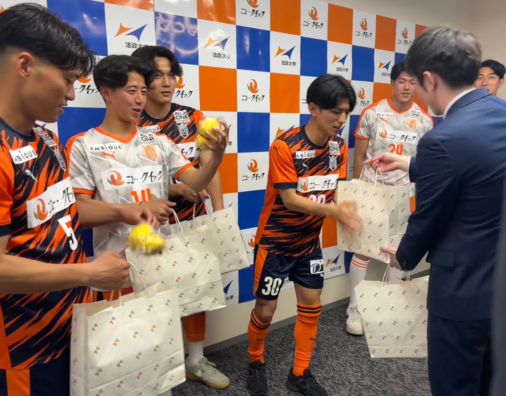記念撮影では、法政大学体育会サッカー部のご協力のもとユニフォームを用いた撮影も行われ、林もキャプテンマークを着用させていただくなど、終始笑顔の絶えないひとときとなりました。また、ニュー・クイックの公式キャラクター「クイッピー」も登場し、会場は和やかな雰囲気に包まれました。あわせて、選手の皆さまへお土産としてニュー・クイックオリジナルカレーセットとクイッピーのぬいぐるみを贈呈しました。