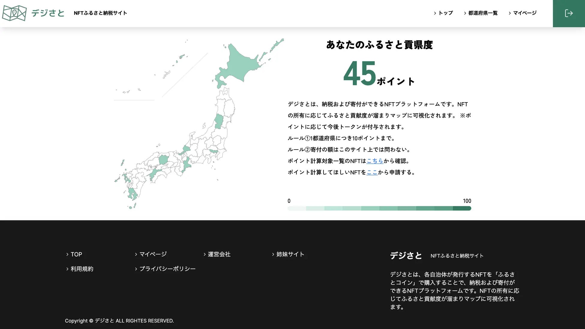 デジさとは、NFTを活用したふるさと納税・地方創生の先駆けとなるサービスです。NFTを通じて、寄附者と自治体の繋がりを可視化し、単なる寄附だけでなく、交流人口・関係人口の創出を目指します。