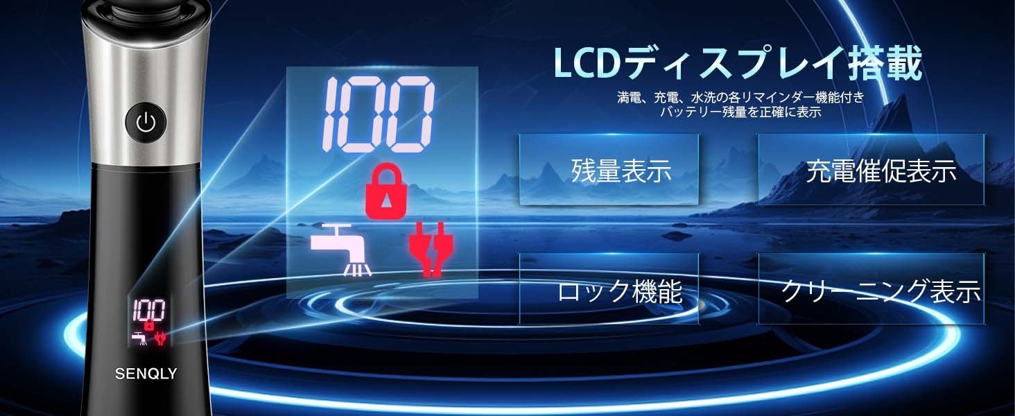 直感的に操作できるLCDディスプレイが搭載されており、バッテリー残量や定期的な洗浄リマインダー、スイッチロック機能など、便利な情報が一目でわかります。初心者でもすぐに使いこなせるのが嬉しいポイントです。特に長押しでのロック解除・ロック機能は、旅行や出張時にも重宝されることでしょう。