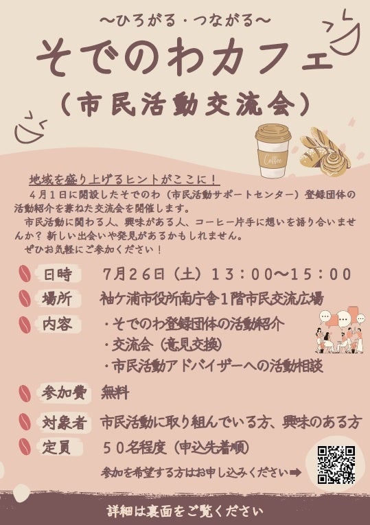 市民活動の輪をさらに広げ、つながりを深めることを目的とした「そでのわ(市民活動サポートセンター)」登録団体による交流イベント 「そでのわカフェ」を開催します。