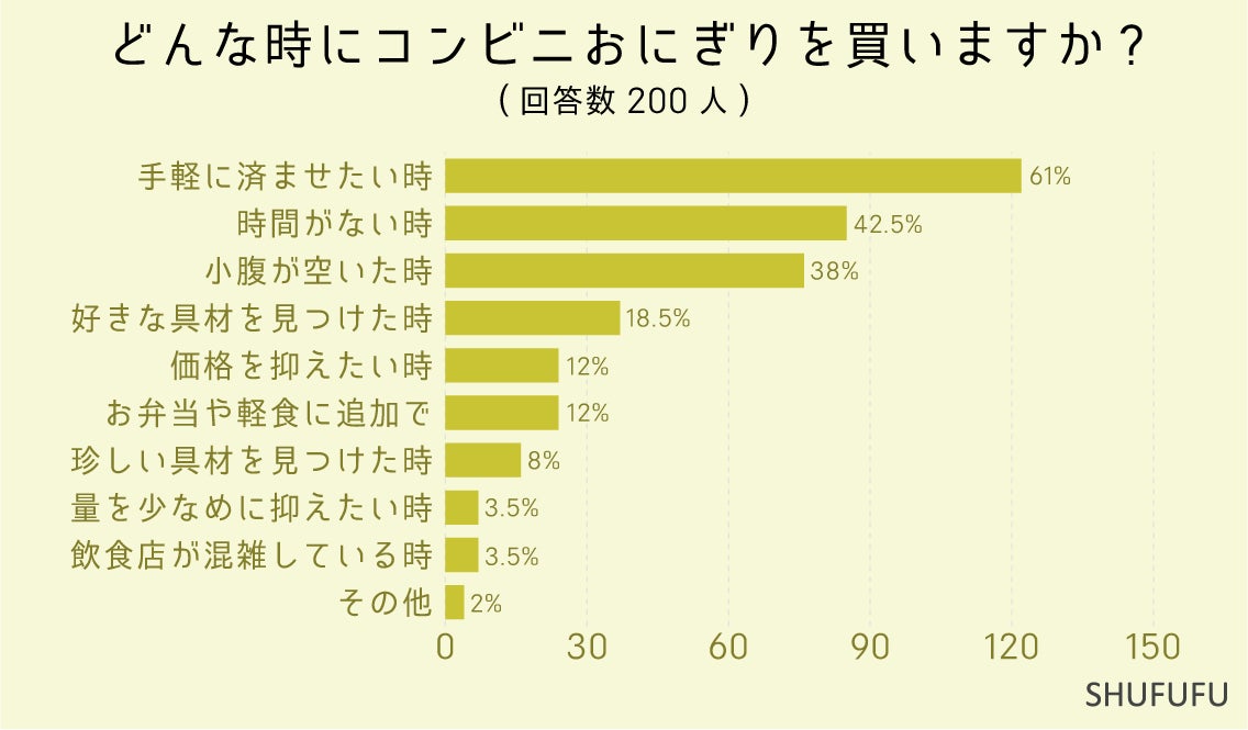 どんな時にコンビニおにぎりを買いますか(複数可)に関しては1位「手軽に済ませたい時(61%)」、2位「時間がない時(42.5%)」でした。急いでいて手早く食事を済ませたいときにコンビニおにぎりを購入する方が多いようです。