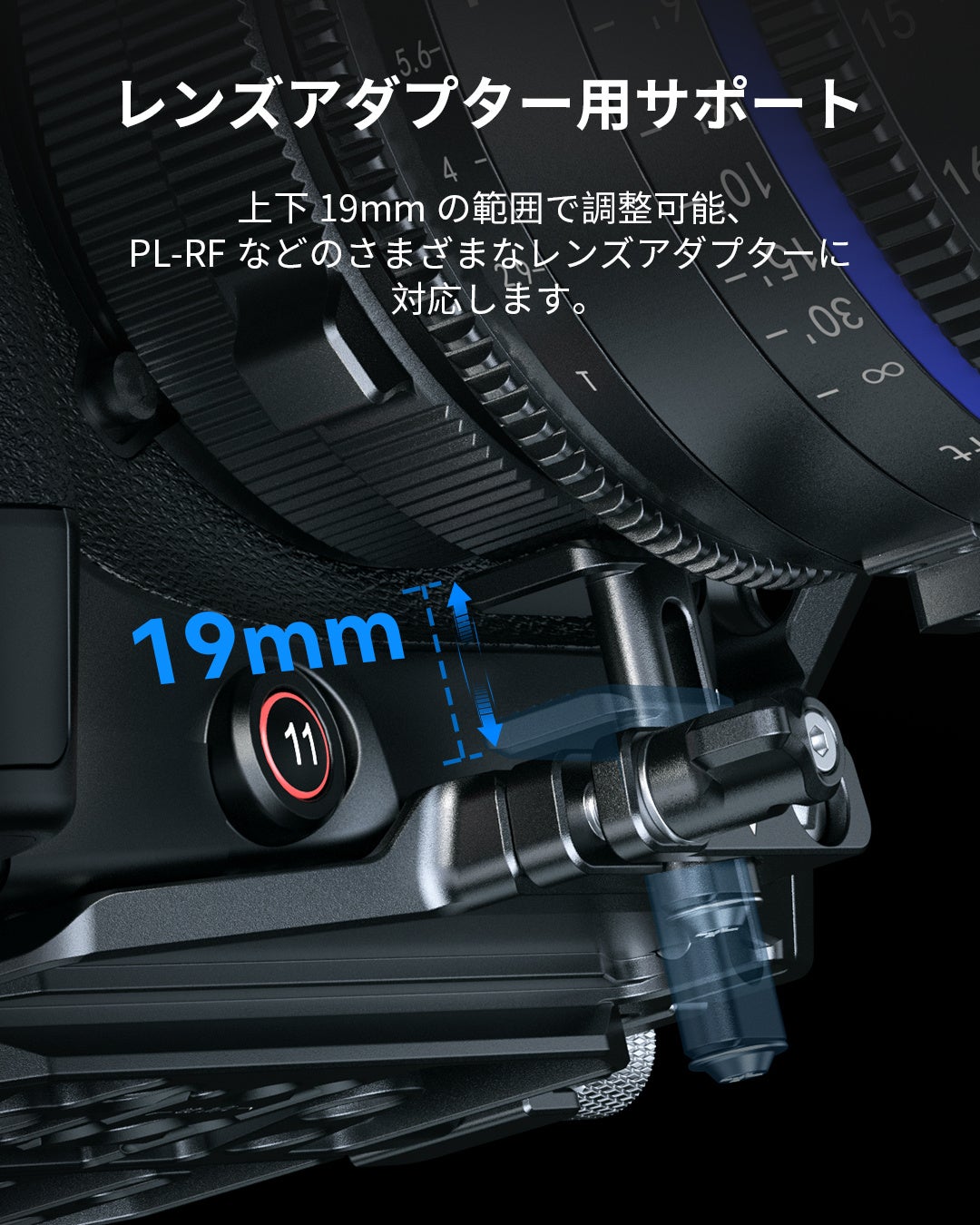 レンズアダプター用サポートも提供され、上下19mmの範囲で調整可能となり、PL-RFなどのさまざまなレンズアダプターに対応します。