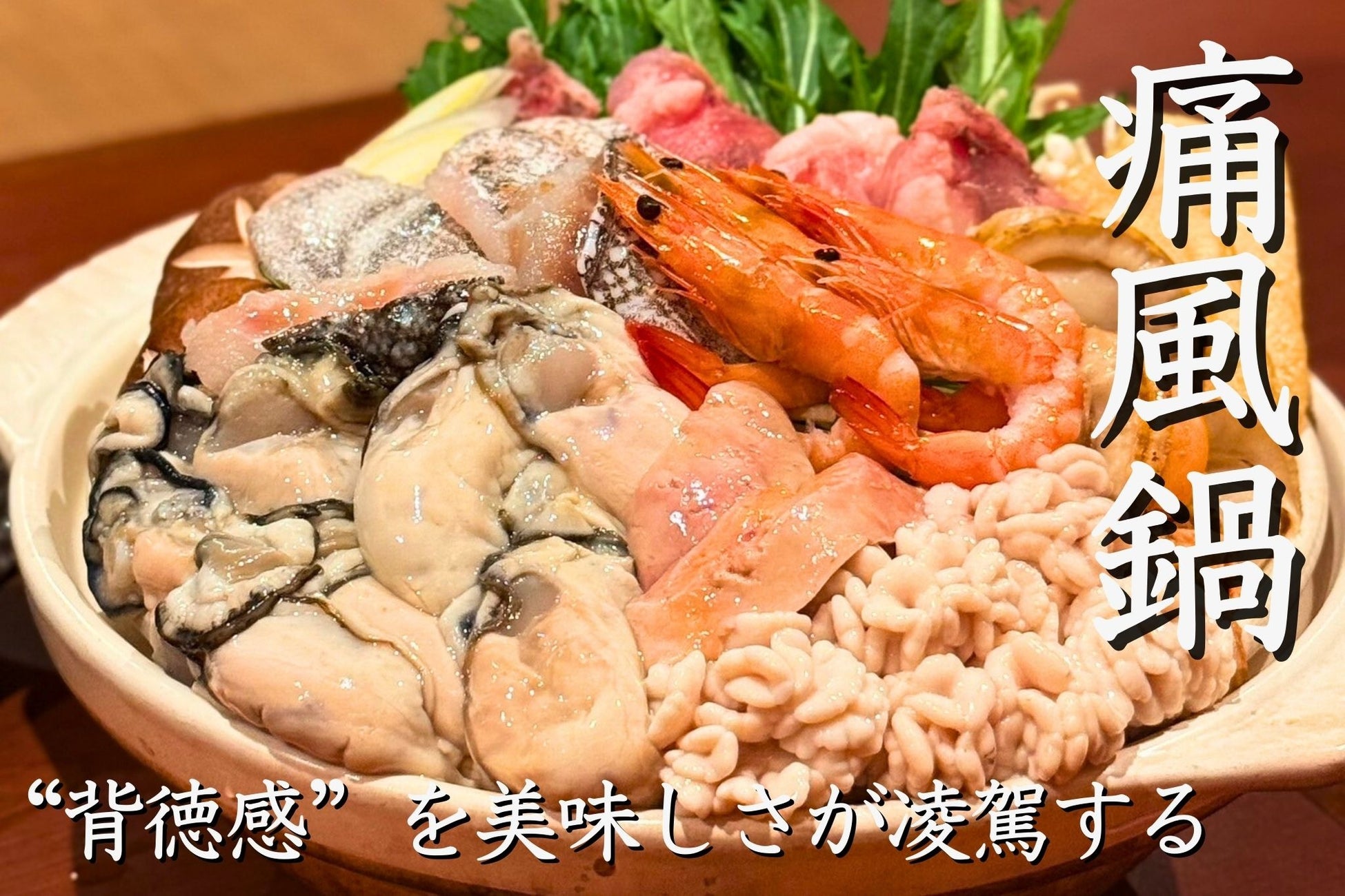 使用する食材は、濃厚な味わいを持つ牡蠣やとろけるような食感のあん肝・クリーミーなたら白子などプリン体たっぷりの海鮮で、まさに禁断の旨味が詰まった逸品となっております。“痛風鍋”が背徳グルメと呼ばれる理由は、「体に良くないかも」という背徳感を、その美味しさが凌駕する、食べるたびに罪悪感よりも幸せが勝る、そんな特別な体験ができることです。この機会に、普段ではなかなか味わえない背徳感をお楽しみください。