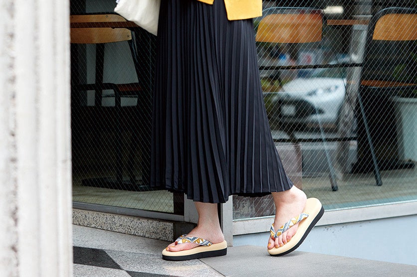 開発箇所はソールだけに留まりません。鼻緒の構造も見直し、「ミルフィーユ製法」と呼ばれる新しい技術を開発。柔らかいスポンジを幾重にも重ねることで、快適な履き心地を実現しています。